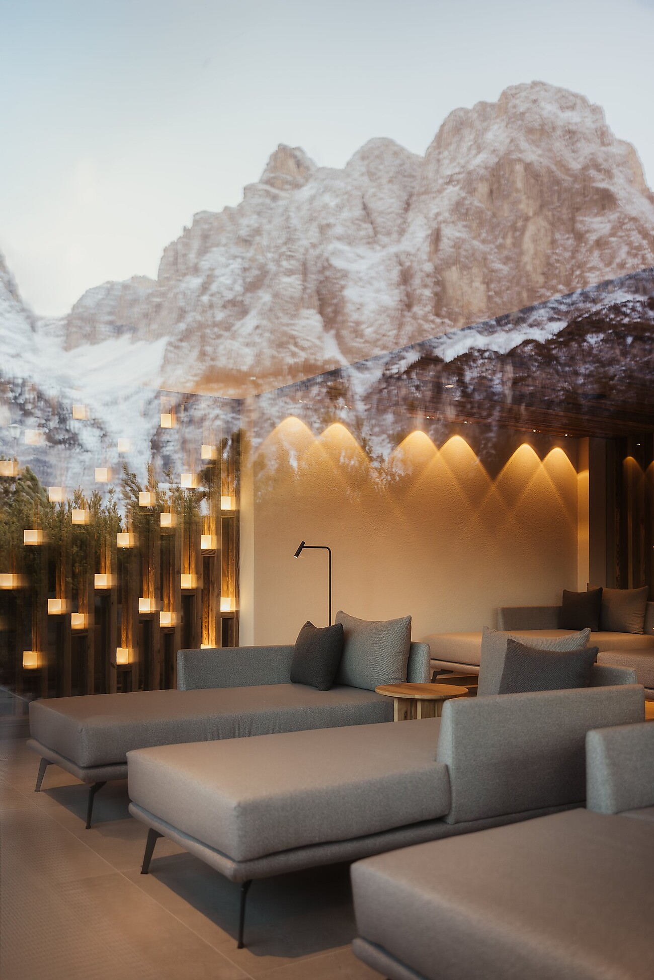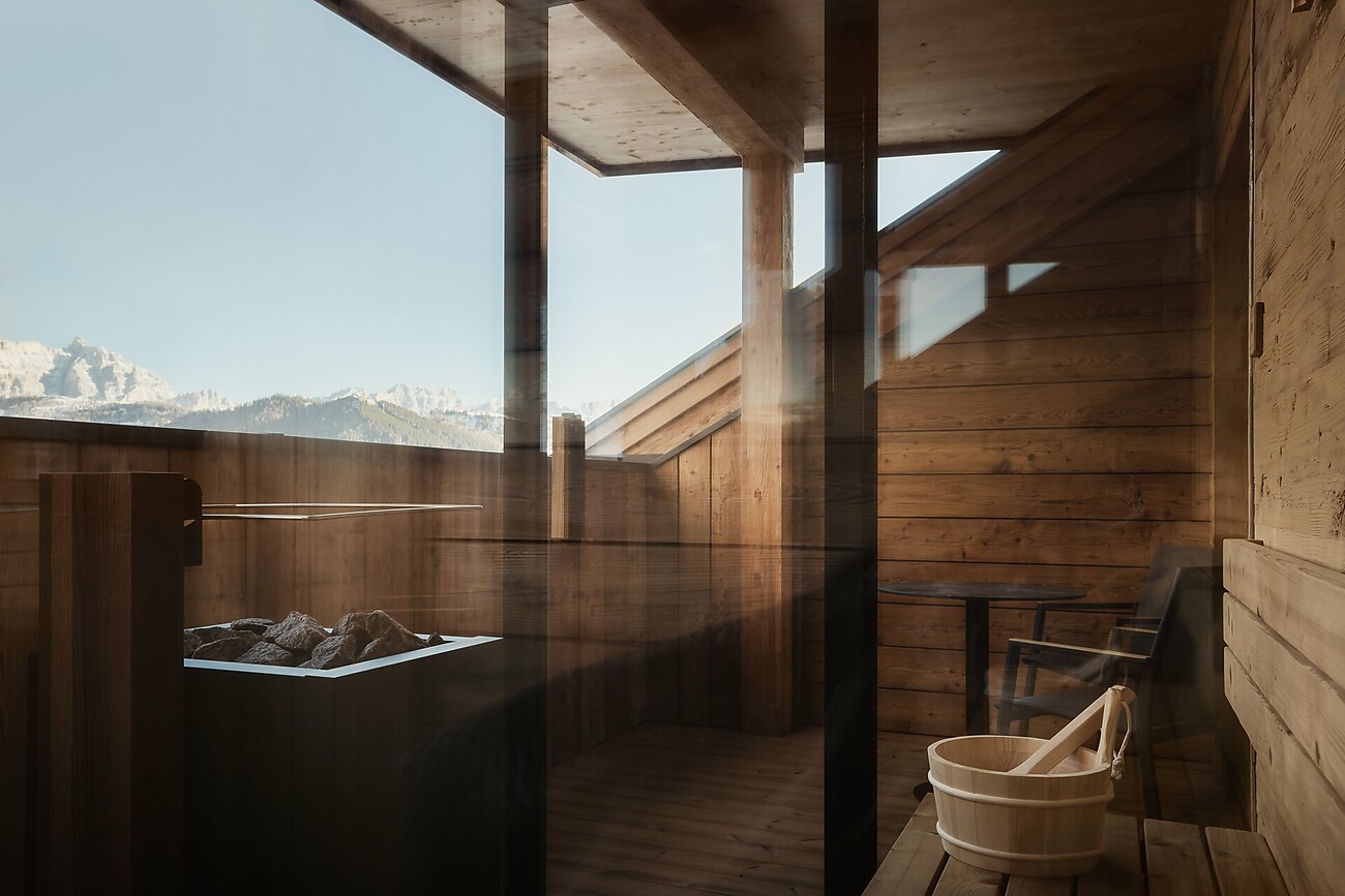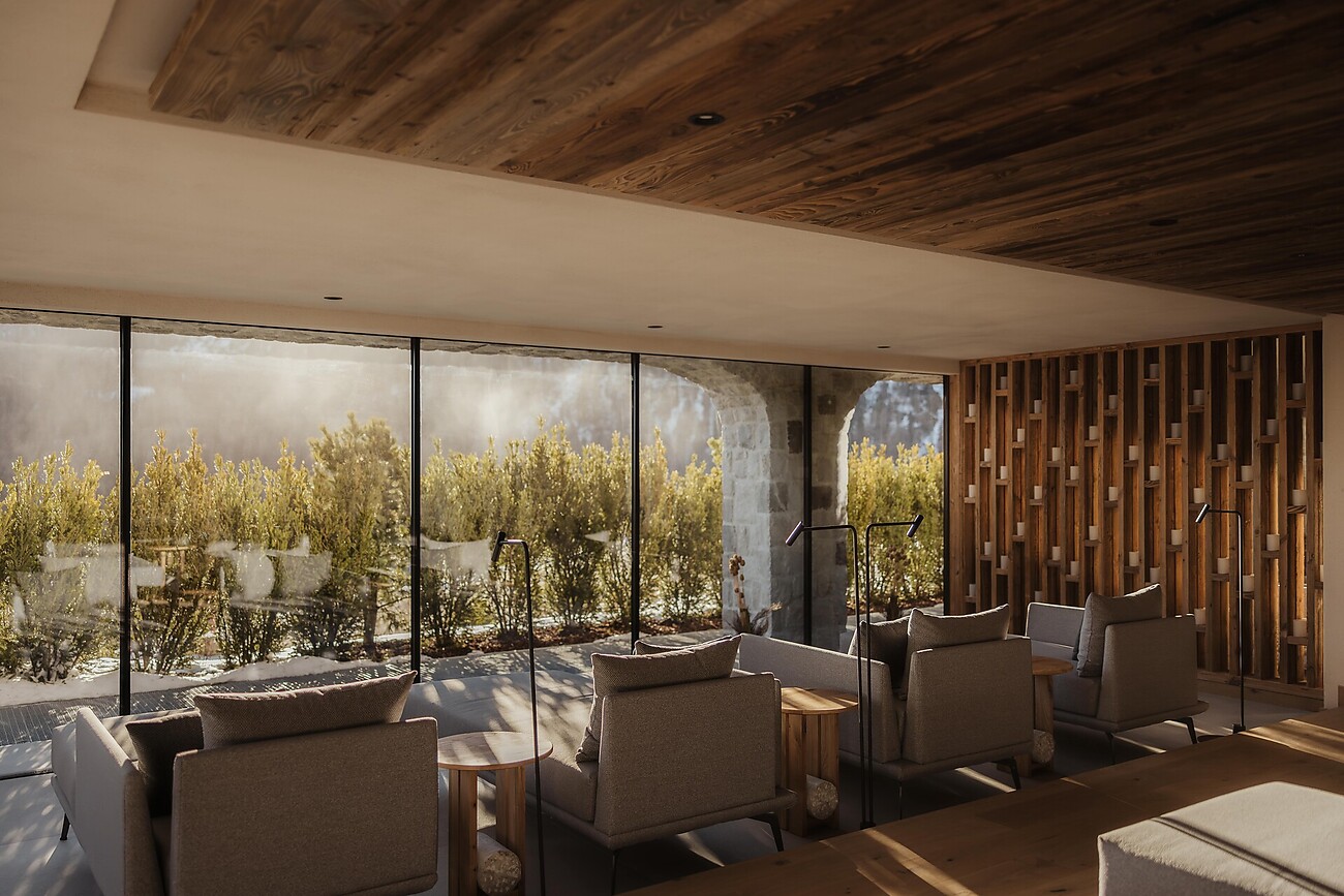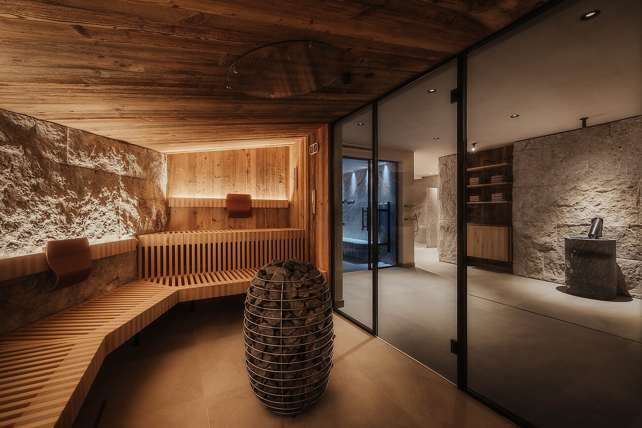 Ein Innenpool mit Lichtwasserfall. Ein Saunabereich mit türkischem Dampfbad, finnischer Sauna, Erlebnisdusche und Infrarotliegen. Ein Outdoor-Jacuzzi mit Panoramablick auf die Dolomiten. Und dann ist da noch der Massage- und Fitnessbereich mit Ruheräumen und Vitalbar. Das alles in Kombination mit Naturtönen, Materialien wie Holz, Rohstein und Metall sowie einer sanften Beleuchtung.