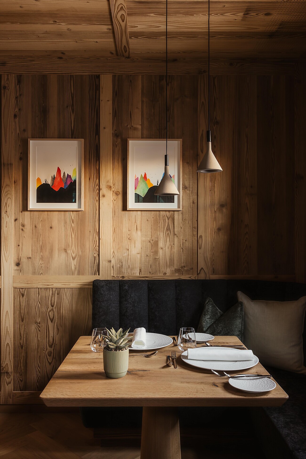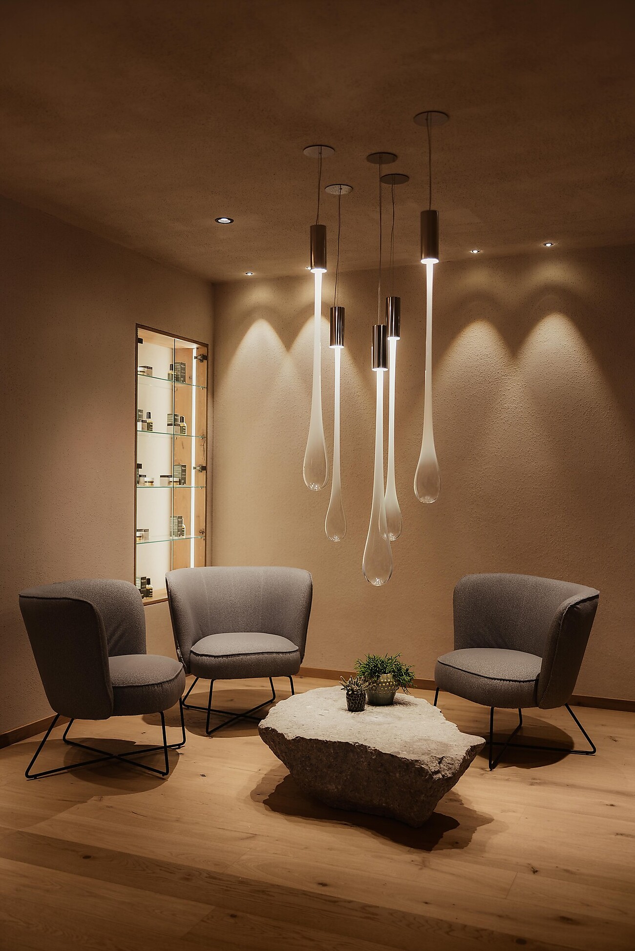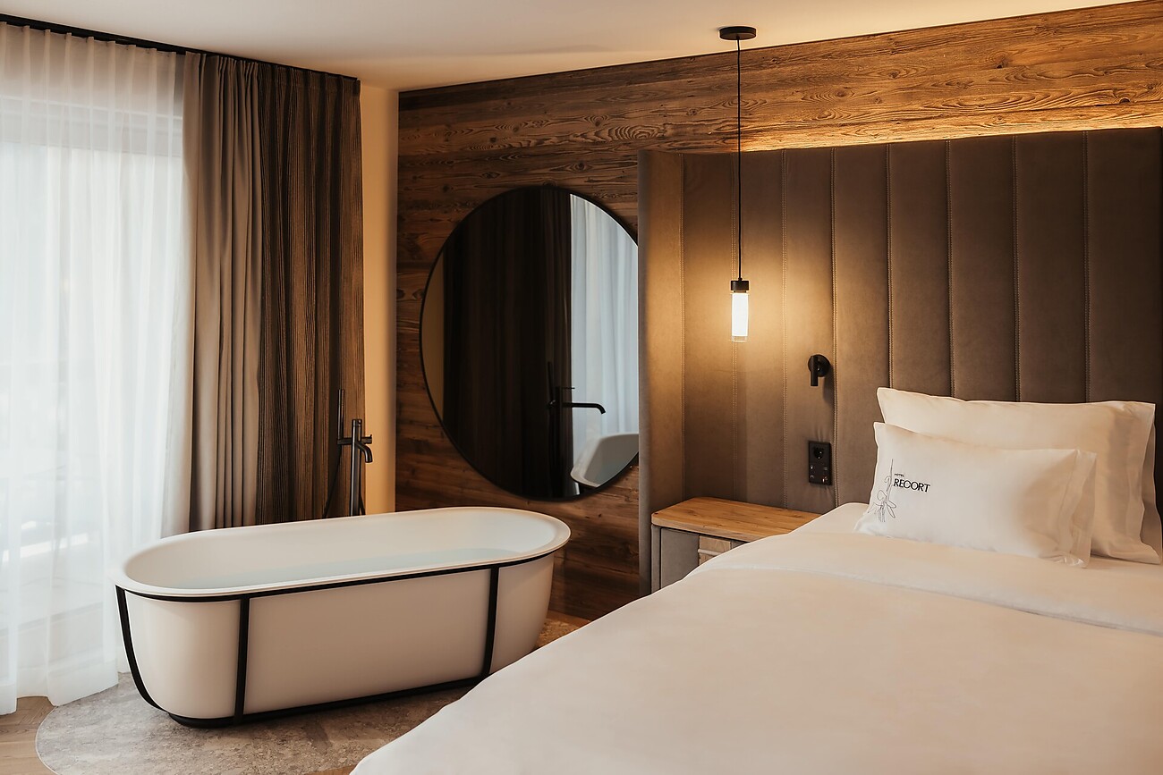 Ein Innenpool mit Lichtwasserfall. Ein Saunabereich mit türkischem Dampfbad, finnischer Sauna, Erlebnisdusche und Infrarotliegen. Ein Outdoor-Jacuzzi mit Panoramablick auf die Dolomiten. Und dann ist da noch der Massage- und Fitnessbereich mit Ruheräumen und Vitalbar. Das alles in Kombination mit Naturtönen, Materialien wie Holz, Rohstein und Metall sowie einer sanften Beleuchtung.