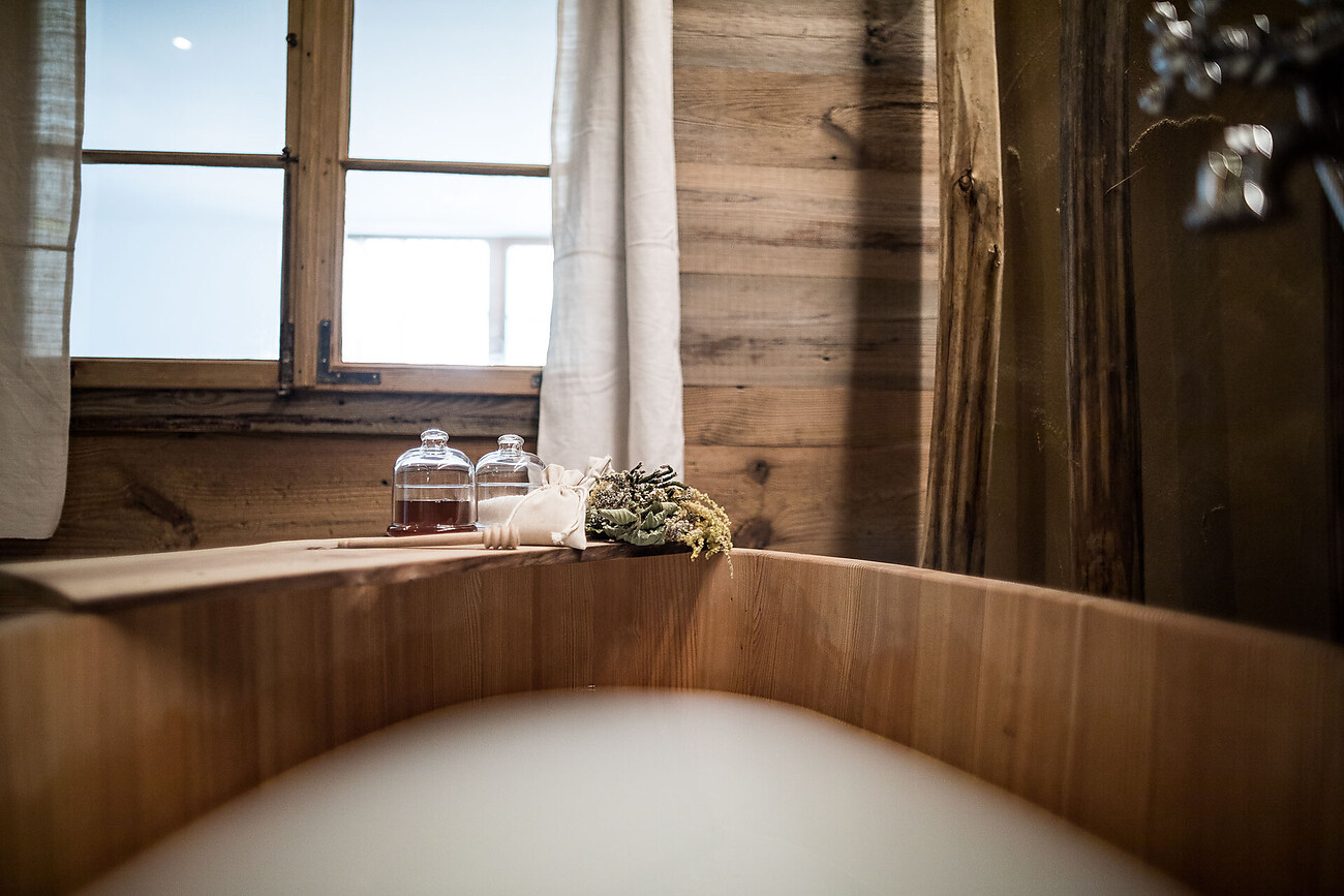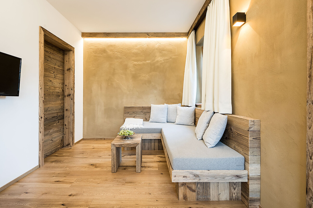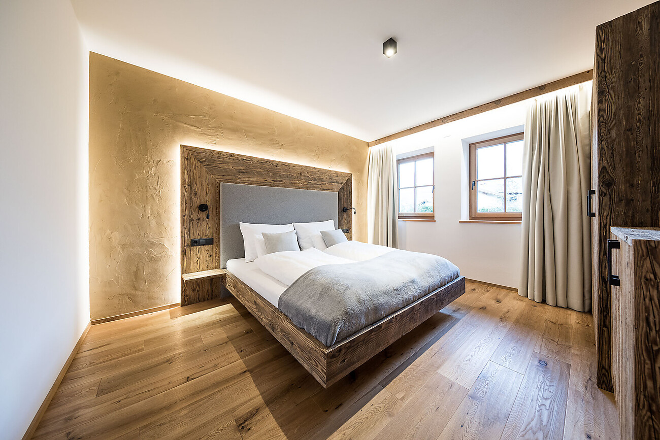 Unsere Ferienwohnungen in Naturmaterialien (Holz, Lehm, Kalk) für je 2 Personen liegen ebenerdig mit direktem Zugang zum Garten mit Blick auf den Badeteich, den Kräuterhügel und die umliegende Bergwelt.