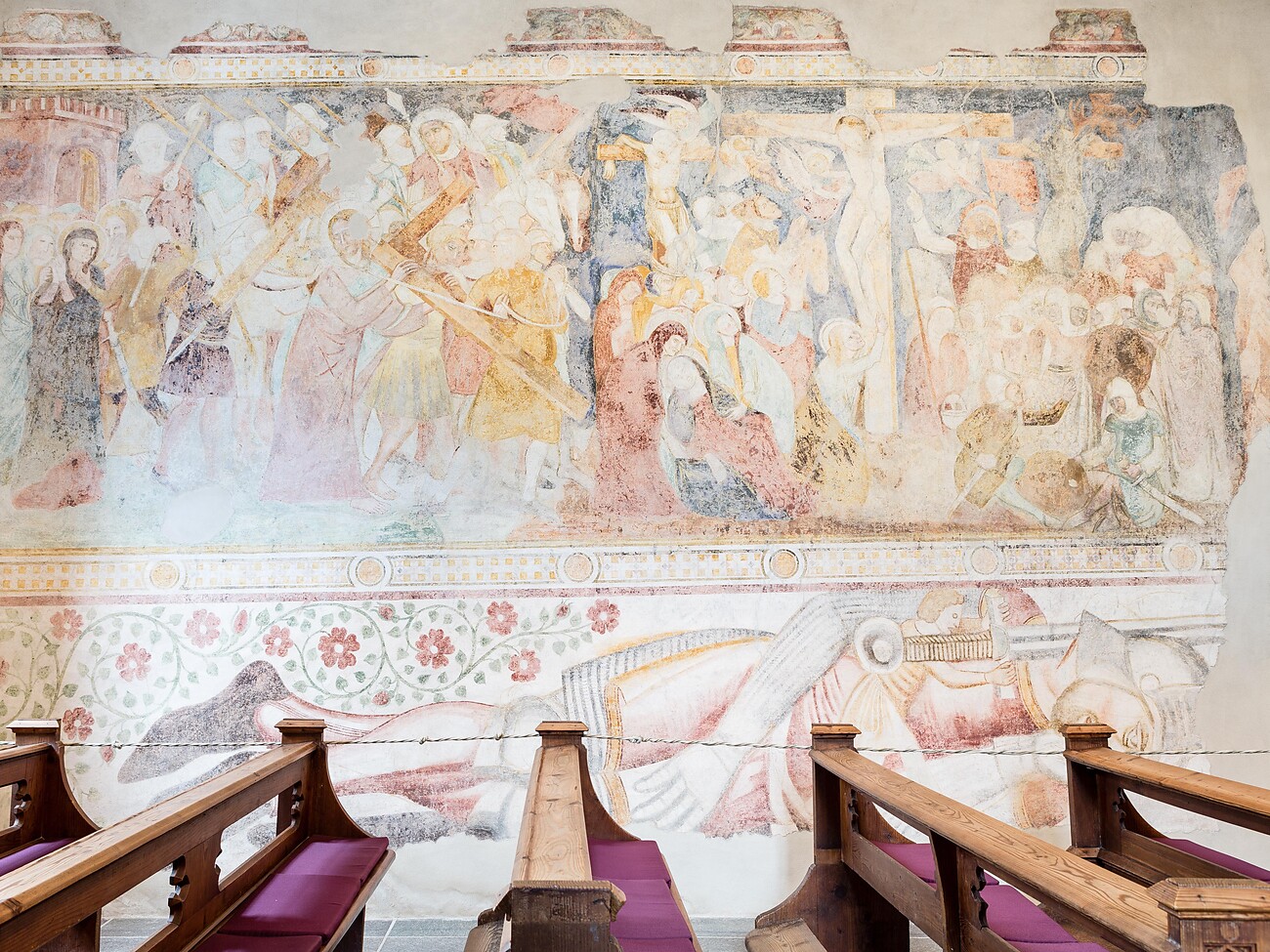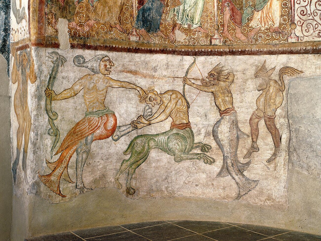 Die Fabelwesen sind so geheimnisvoll, dass sie die Betrachter unwillkürlich in ihren Bann ziehen. Sie begegnen Figuren wie Vogelfrau und Ziegenfisch, Hundsköpfigen, Schattenfüßler und vielen mehr. Lassen Sie sich in das Reich voll archaischer Schönheit und voller Rätsel entführen. Die Kapelle bietet wunderbare Fresken aus der Zeit der Romanik und Gotik mit vielen spannenden Szenen, welche in einer Zeit zwischen 1220 und 1450 entstanden sind. Dauer ca. 45 Minuten.