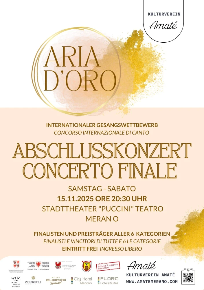 Am Samstag, 15. November 2025, um 20:30 Uhr verwandelt sich das Stadttheater Meran in ein Zentrum großer Emotionen: Beim feierlichen Abschlusskonzert des internationalen Gesangswettbewerbs „Aria d'Oro“ präsentieren sich die besten Nachwuchstalente einem begeisterten Publikum.