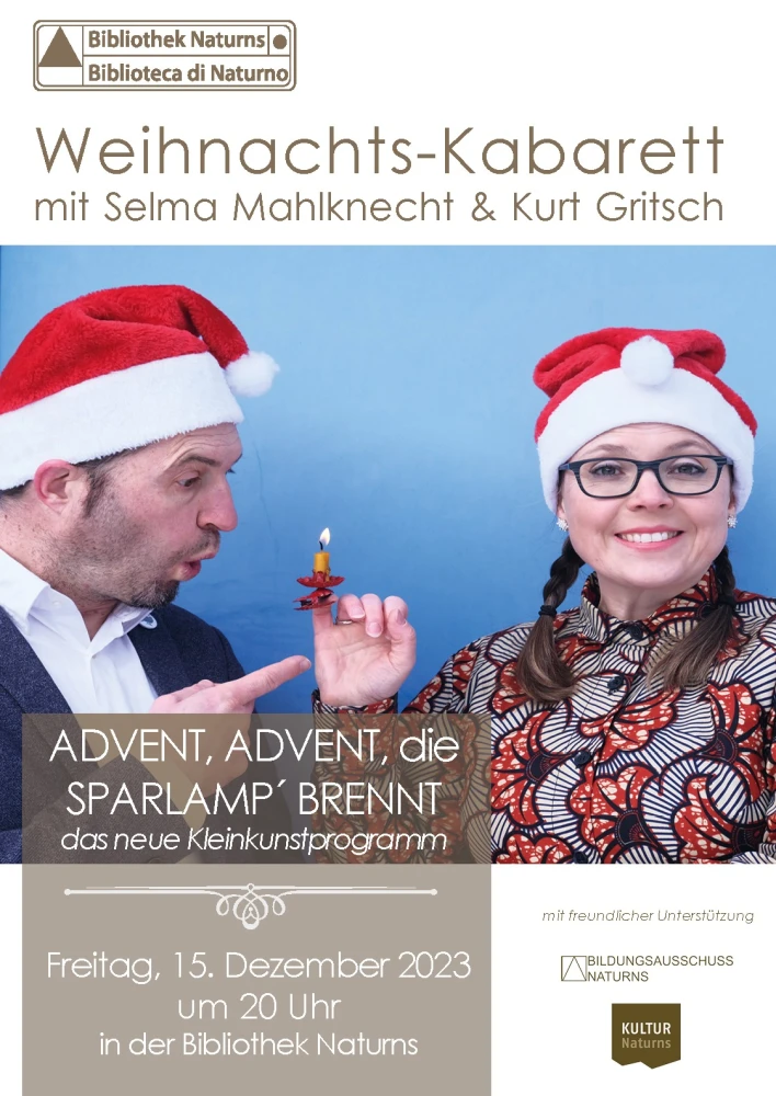 „Advent, Advent, die Sparlamp‘ brennt “ ist ein 90-minütiges satirisches Kleinkunstprogramm aus der Feder von Selma Mahlknecht, ein Mix aus Sketchen, Liedern und Gedichten unter dem Motto: „Humor ist, wenn man trotzdem lacht“. Oder auch deswegen. Oder einfach grundsätzlich, weil Lachen ja die beste Medizin ist.