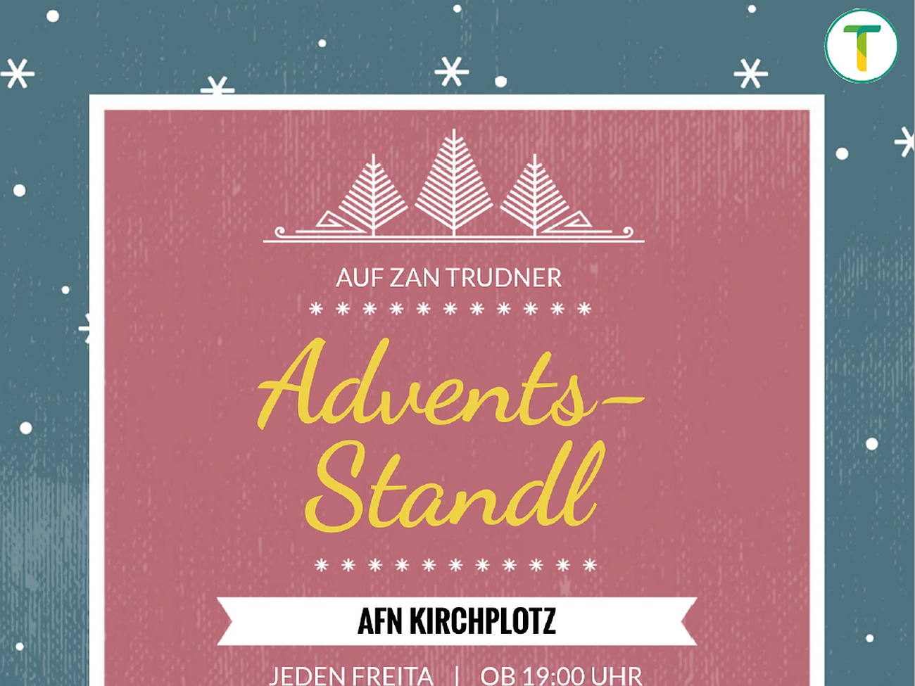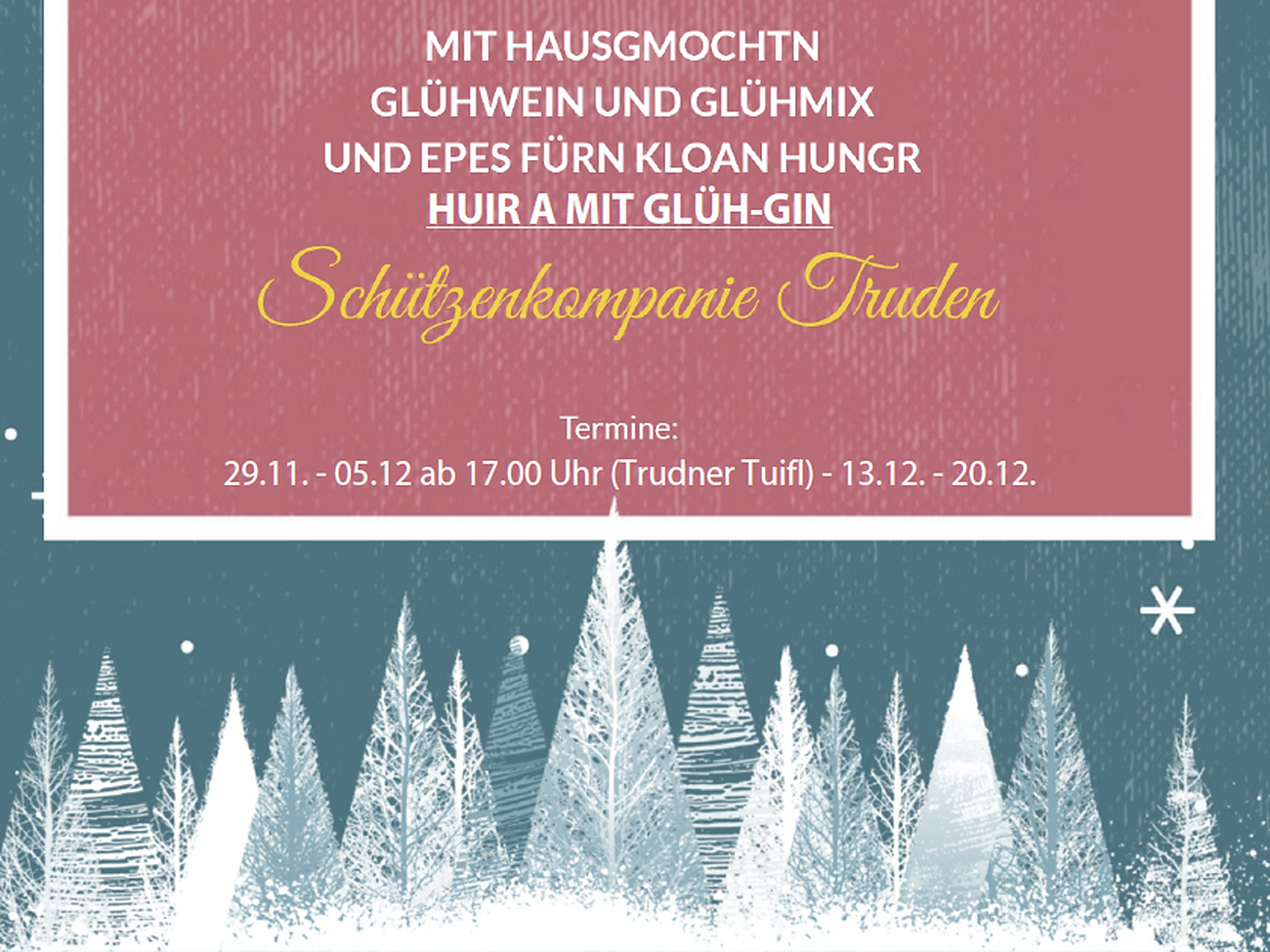 Die Schützenkompanie Truden lädt in der Adventszeit jeden Freitag, alle herzlich zu ihrem Adventstandl ein. Ein geselliges Beisammensein mit Glühwein, Glühmix und heuer auch Glüh-Gin! Es wird auch etwas zu essen für den kleinen Hunger geben.