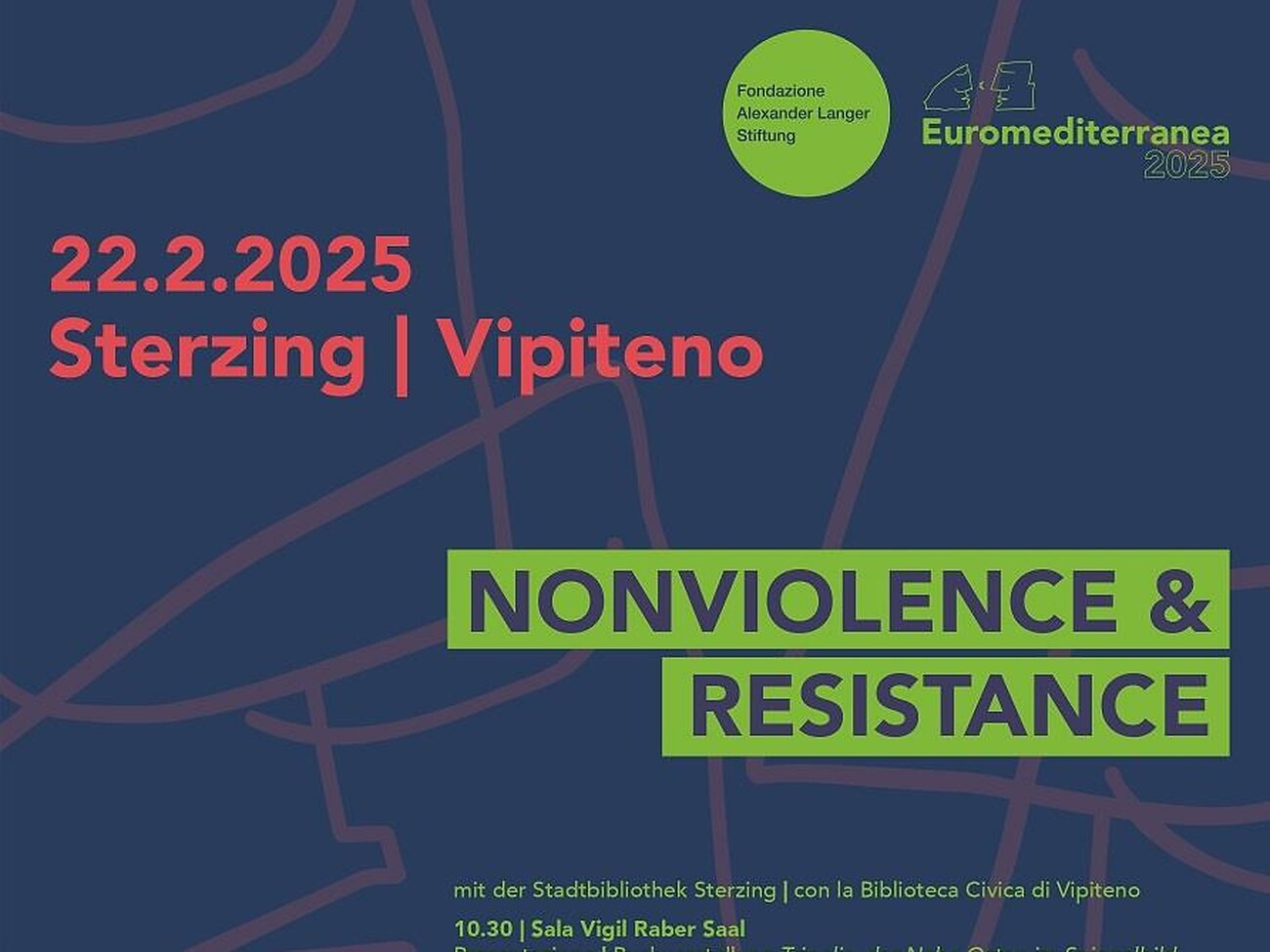 Die Veranstaltungen in Sterzing sind Teil der wichtigsten öffentlichen und jährlich abgehaltenen Veranstaltung der Alexander Langer Stiftung, der Euromediterranea, die seit 1997 eine Gelegenheit zum gemeinsamen Nachdenken und zur Verbreitung der Themen bietet, die Alexander Langer am Herzen lagen. Die beiden Veranstaltungen in Sterzing, sind eine Zusammenarbeit der Alexander Langer Stiftung mit der Stadtbibliothek Sterzing und können dank der Unterstützung der Gemeinde Sterzing sowie unter der Schirmherrschaft des italienischen Bildungsausschusses Sterzing abgehalten werden.