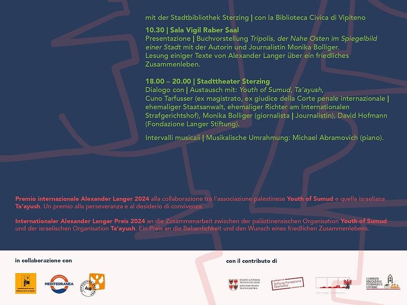 2024 haben die Freiwilligenorganisationen Ta’ayush („Zusammenleben“) und Youth of Sumud aus Israel und Palästina den Internationalen Alexander-Langer-Preis für ihre Bemühungen um ein friedliches Zusammenleben erhalten. Am 22. Februar werden um 18 Uhr im Stadttheater Sterzing Vertreter*innen der beiden Organisationen anwesend sein und an einer Podiumsdiskussion mit dem Juristen Cuno Tarfusser und der Journalistin Monika Bolliger teilnehmen. Der Abend wird vom bekannten rumänisch-israelischen Pianisten Michael Abramovich musikalisch begleitet. Am Vormittag findet bereits um 10.30 Uhr die Buchvorstellung „Tripolis: Der Nahe Osten im Spiegelbild einer Stadt“ mit der Journalistin und Autorin Monika Bolliger statt. Parallel dazu werden Texte zum Thema „Zusammenleben“ von Alexander Langer gelesen.