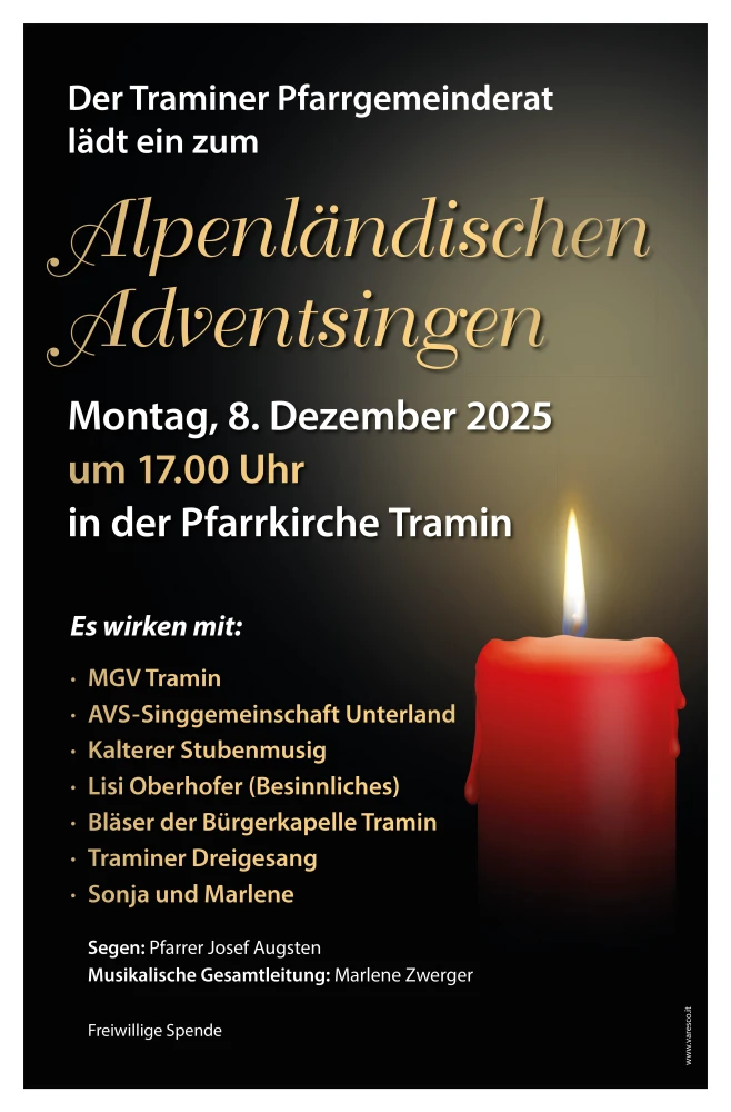 Veranstalter: Pfarrgemeinderat TraminDer Traminer Pfarrgemeinderat lädt ein zum Alpenländischen Adventsingen