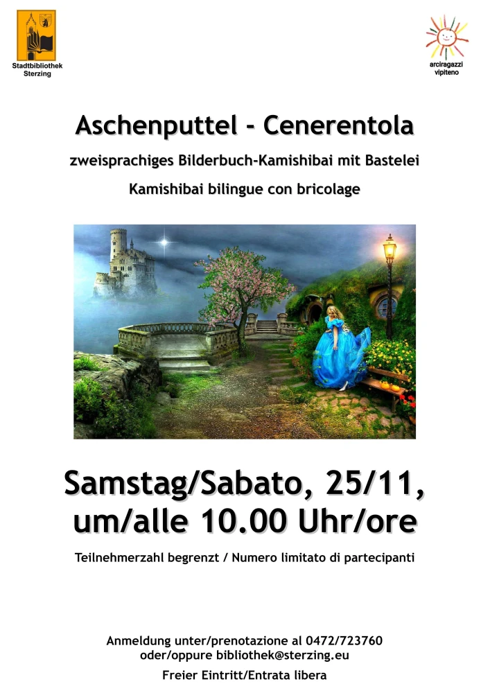 Am Samstag, den 25. November 2023, findet um 10.00 Uhr wieder die zweisprachige Märchen-Kamishibai-Veranstaltung für Kinder von drei bis sechs Jahren in der Stadtbibliothek Sterzing statt. Unsere Vorleserinnen Giulia und Margit präsentieren im November das Grimm-Märchen „Aschenputtel“ und laden im Anschluss alle Kinder zu einer Bastelei ein. Der Termin für das nächste zweisprachige Märchentreffen wird noch rechtzeitig bekannt gegeben.