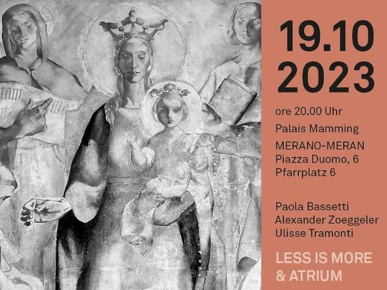 Wir laden Sie am dritten Tag der Atrium-Tage 2023 ins Palais Mamming Museum ein, der am 19. Oktober um 20.00 Uhr stattfindet. Vorträge zum Erbe der Architektur der Moderne in Meran, zur historischen Kontextualisierung im Rahmen des vom Europarat unterstützten internationalen Atrium-Projektes, zum Buch "Less is more" und zu einigen bedeutenden Fresken in Meran aus der Zeit zwischen den Weltkriegen stehen auf dem Programm.