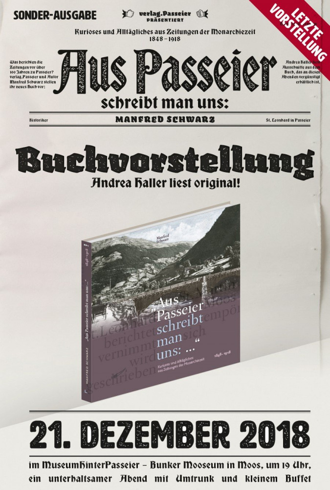 Aus Passeier schreibt man uns...: Manfred Schwarz hat Zeitungen zwischen 1848 - 1918 durchforstet und Kuriositäten aus dem Passeiertal zusammengetragen. Die letzte Buchpräsentation findet am 21.12.2018 im MuseumHinterPasseier - Bunker Mooseum statt. Vorgetragen wird das Buch von der Schauspielerin Andrea Haller. Im Anschluss gibt es einen kleinen Umtrunk und ein Buffet.