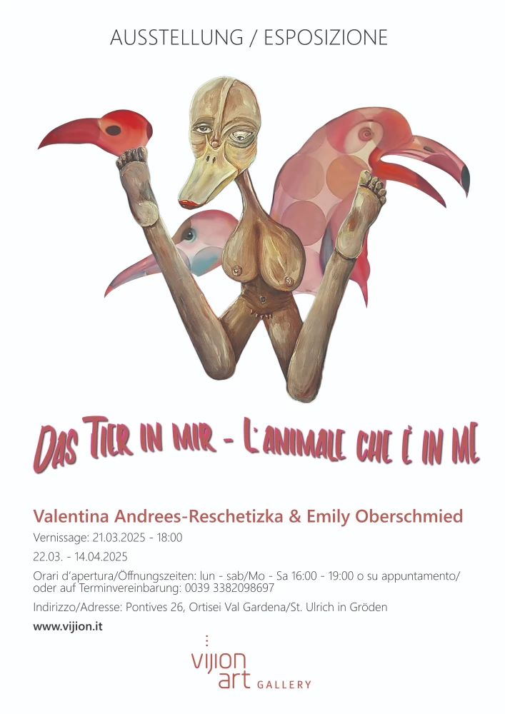 Diese wechselseitige emotionale Verbundenheit zwischen Mensch und Tier wird in der Ausstellung „Mensch-Tier“ von den Künstlerinnen Valentina Andrees und Emily Oberschmied bildlich dargestellt. Beide Künstlerinnen haben ihre persönliche Ausdrucksform, die unterschiedlicher nicht sein könnte. Während Valentina Andrees sich einer sehr realistischen Sprache bedient und mit viel Einfühlungsvermögen auf besondere Merkmale und Details eingeht, setzt Emily Oberschmied auf Empfindungen, Imagination und Körperbewusstsein in Bezug auf die Tierwelt.