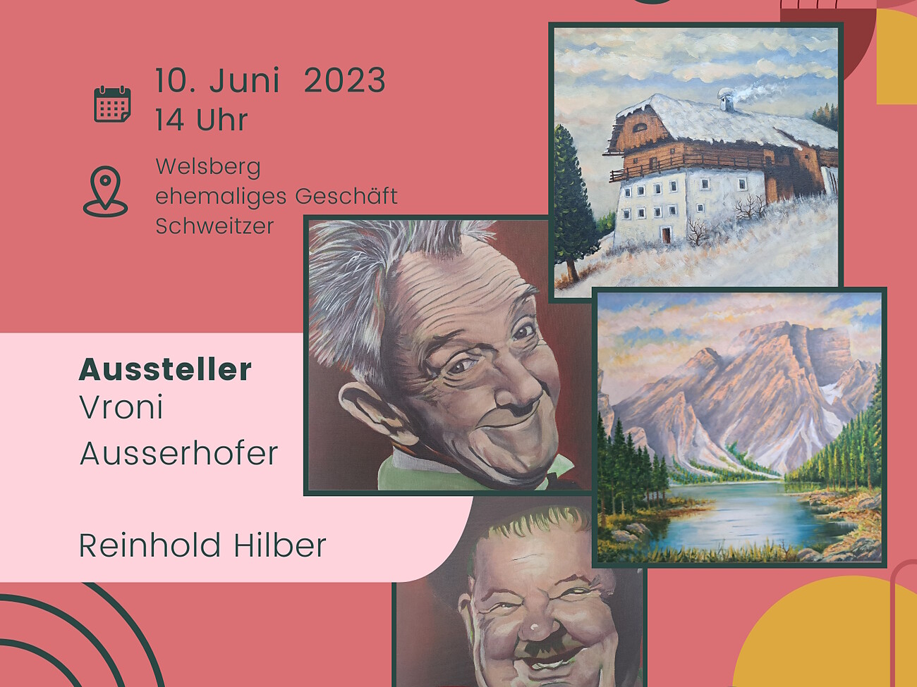 Open Air Sommerausstellung Vroni Ausserhofer & Reinhold Hilber, Malerei, in den Schaufenstern vom ehemaligen Geschäft Schweitzer in Welsberg. Die Ausstellung ist rund um die Uhr geöffnet.