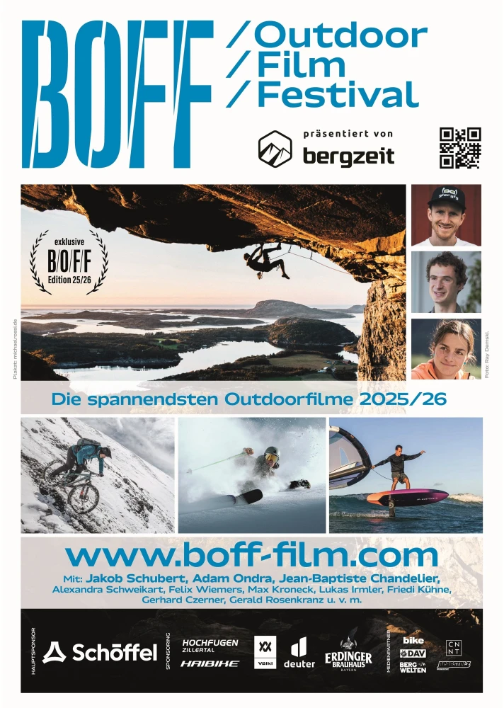 Das Bayerische Outdoor Filmfestival (BOFF) präsentiert eine Auswahl preisgekrönter Outdoor-Kurzfilme aus dem internationalen Raum. Gezeigt werden Filme übers Klettern, Skifahren, Mountainbiken, Highlinen, Gleitschirmfliegen und Surfen – mal ernst, mal lustig, mal persönlich oder dokumentarisch.