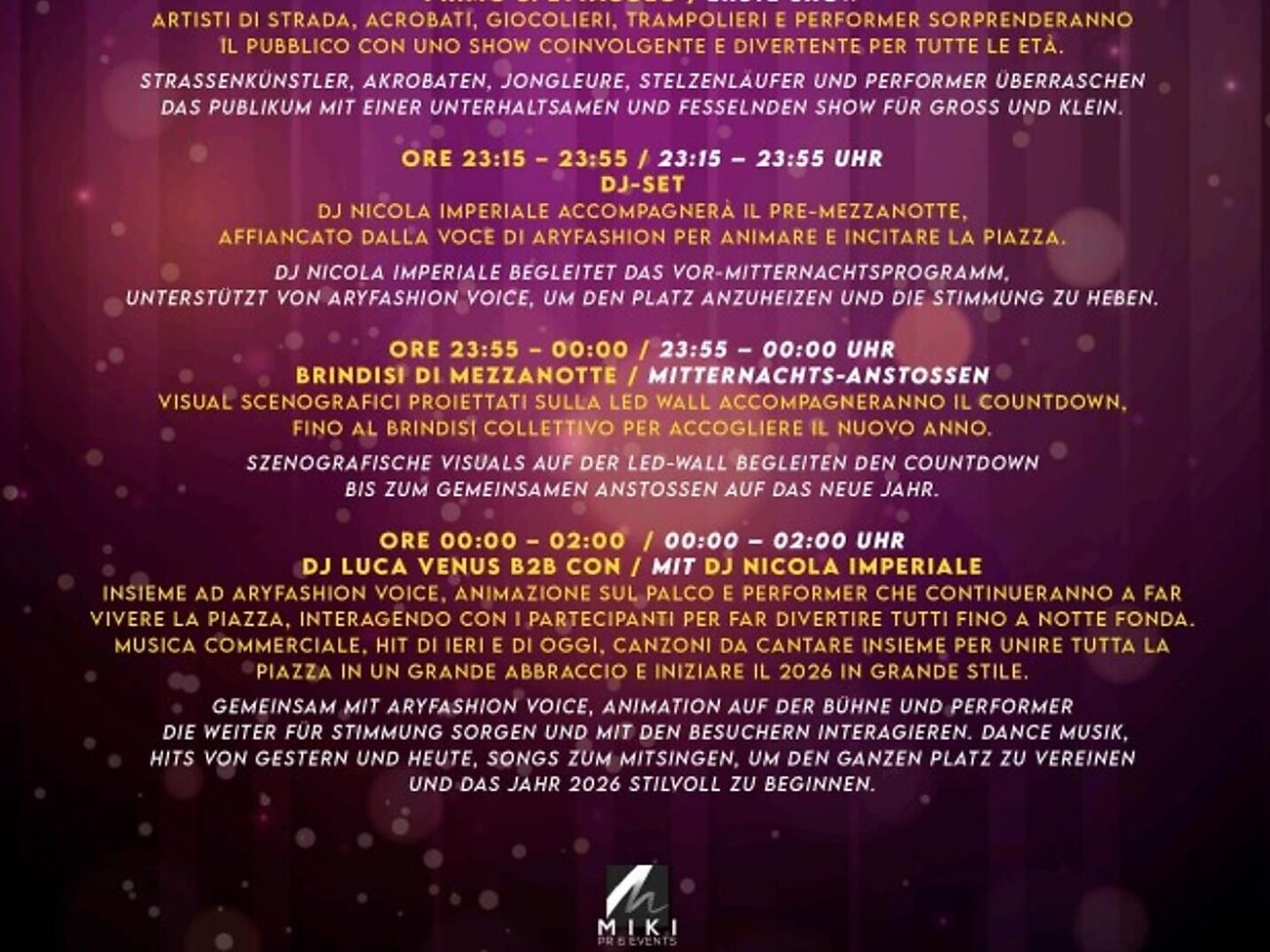 Der Weg zur Mitternacht wird vom DJ-Set von Nicola Imperiale begleitet, der ab 23:15 Uhr mit steigender Intensität Rhythmus und Stimmung aufbaut. Die Stimme von Aryfashion bringt zusätzliche Animation und Charisma ein, um die Menge anzufeuern und die Stimmung weiter anzuheben.