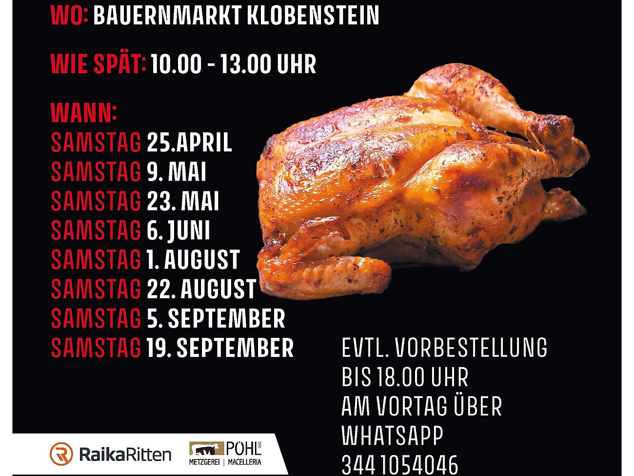 Die Freiwillige Feuerwehr Lengmoos/Klobenstein bietet beim Bauernmarkt in Klobenstein einen Brathuhn-Takeaway von 10–13 Uhr an.