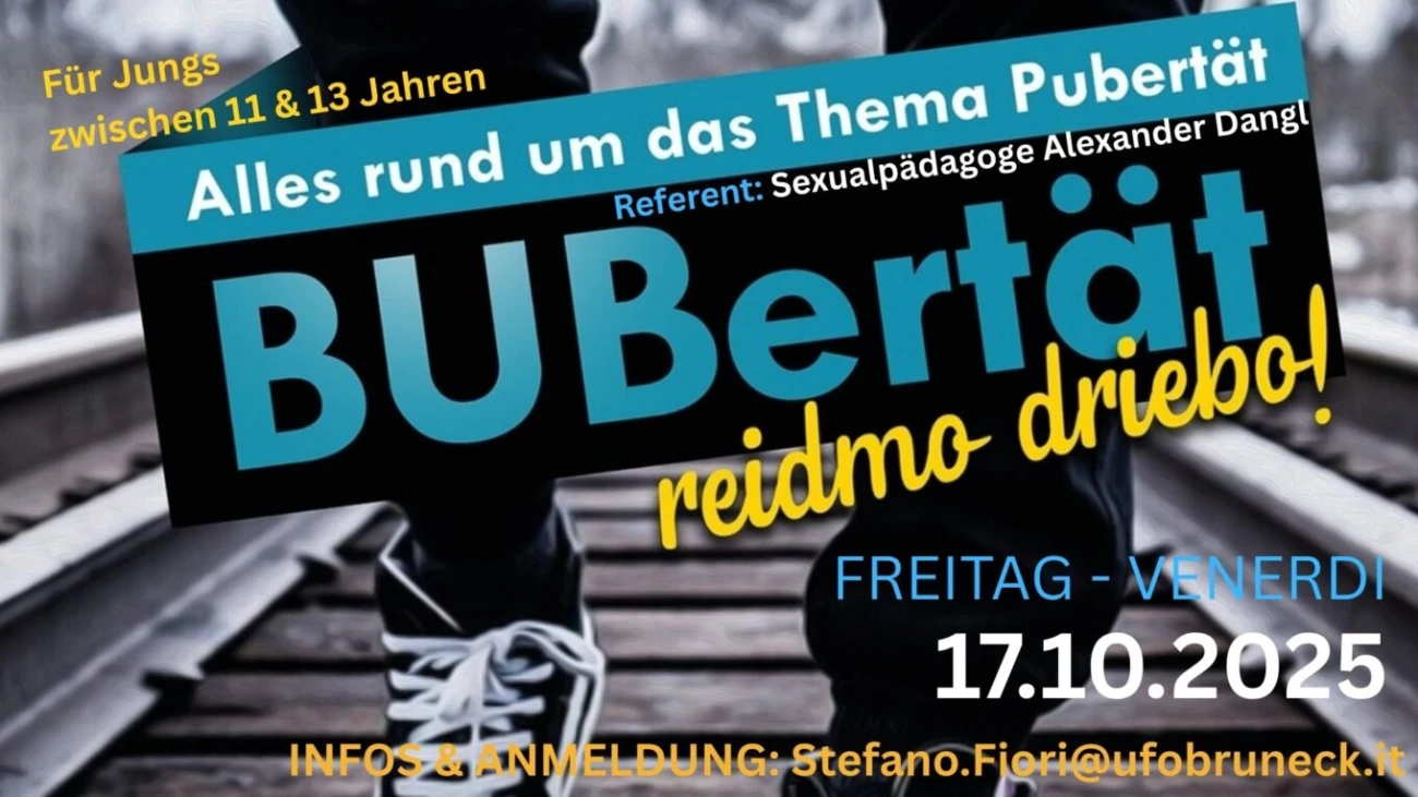 Veranstalter: UFO Jugend- und KulturzentrumDer Workshop spricht an, was sich in der Pubertät verändert. Die Buben zwischen 11 und 13 Jahren vertiefen, wie Pubertät funktioniert und setzen sich mit vielen Körperfragen auseinander: Wann wachsen Schamhaare und Bart? Wie verändern sich Hoden und Glied? Welchen Weg gehen Samenzellen? Wie kommt es, dass Männer Kinder zeugen können? Was bewirkt Testosteron?