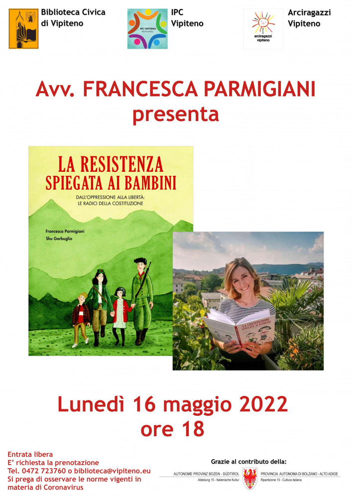 Veranstalter: Stadtbibliothek SterzingAm Montag, den 16. Mai, ist Francesca Parmigiani um 18 Uhr in der Stadtbibliothek Sterzing zu Gast und präsentiert ihre Bücher „La Costituzione spiegata ai bambini“ (2020) e „La Resistenza spiegata ai bambini“ (2022), herausgegeben bei BeccoGiallo.