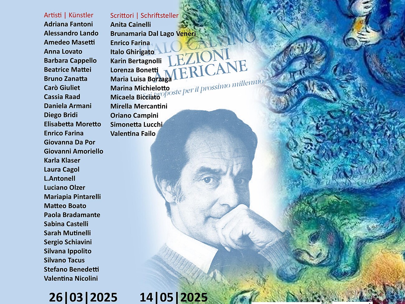 Vierzig Jahre nach dem Tod zweier großer Persönlichkeiten der Weltkultur, Italo Calvino und Marc Chagall, erinnern der Italienische Verband der Künstler von Trento | Bozen FIDA sowie der ASSB - Associazione Scrittrici e Scrittori di Bolzano mit einer Veranstaltung in der Stadtgalerie Bozen an die beiden herausragenden Künstler.