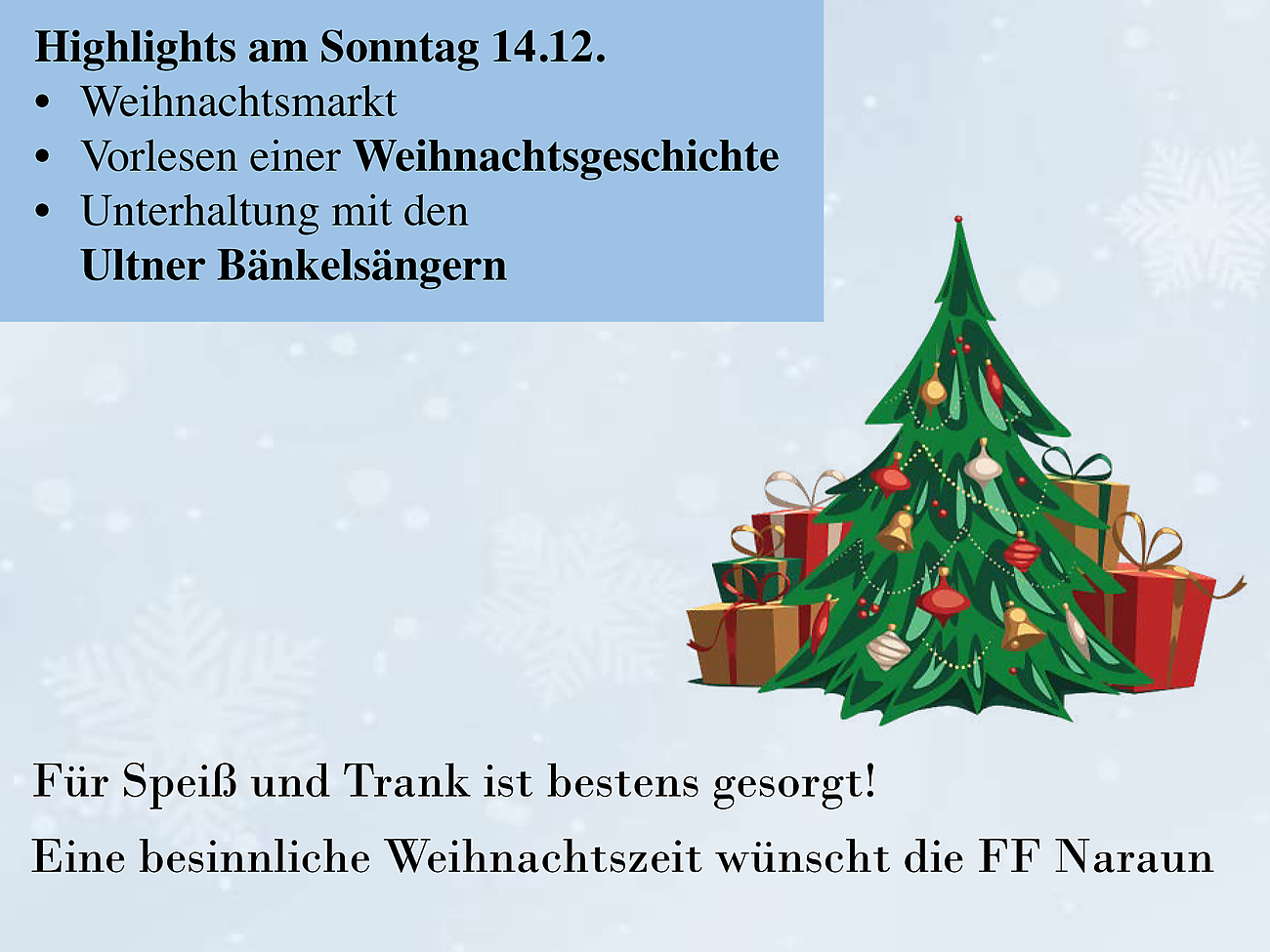 Die Freiwillige Feuerwehr Naraun freut sich auf Euer kommen und wünscht eine besinnliche Weihnachtszeit!