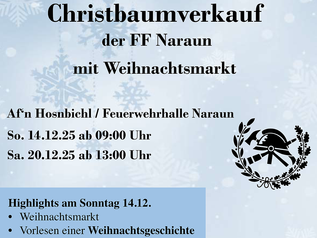 Am Sonntag, 14.12.2025 ab 9 Uhr und am Samstag, 20.12.2025 ab 13 Uhr verkauft die FF Naraun am Hosnbichl Weihnachstbäume mit einem idyllischen vorweihnachtlichen Rahmenprogramm:
