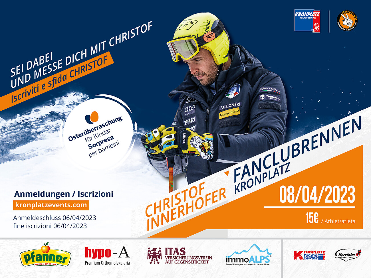 Christof Innerhofer lädt am Samstag, 08. April, zu seinem Fanclubrennen am Hausberg von Bruneck ein. Das Rennen wird auf der Piste Nr.3 Pramstall stattfinden mit Zieleinlauf bei der Herzl Alm bei der Mittelstation Ried. Für Stimmung, Speiß und Trank wird bestens gesorgt. Auf der Sonnenterasse werden nach der Preisverteilung großartige Sachpreise verlost. Für unsere kleinen Gäste haben wir eine Überraschung vorbereitet, Silvia Fontanive übernimmt die Moderation und AlbiDJ sorgt für die musikalische Umrahmung.