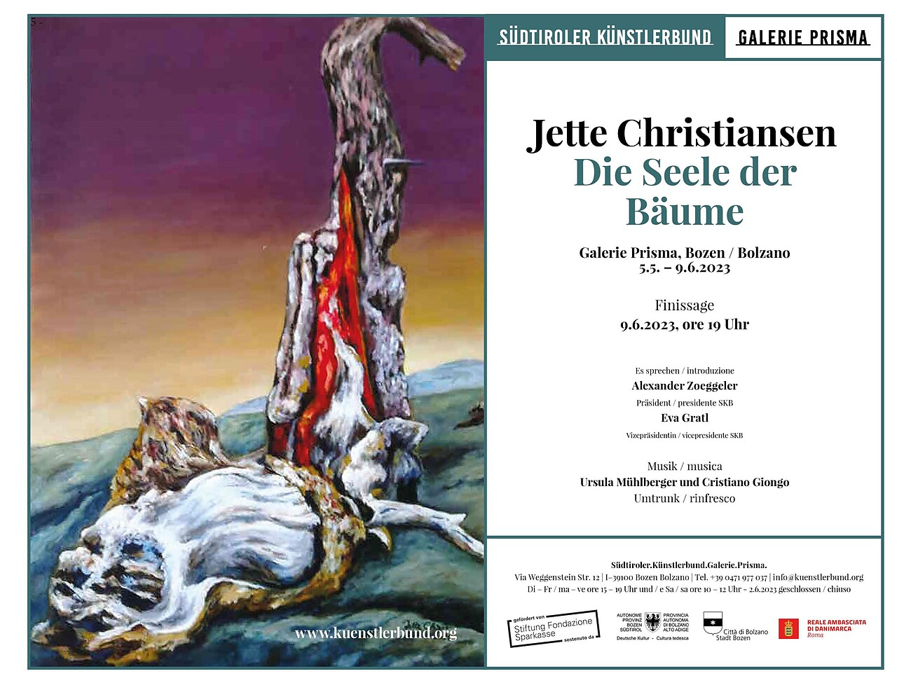 Die Finissage am 9. Juni findet in Anwesenheit von Präsident Dr. Alexander Zöggeler und Vizepräsidentin Dr. Eva Gratl des Südtiroler Künstlerbundes statt. Im Anschluss gibt es einen Umtrunk mit musikalischer Begleitung durch Ursula Mühlberger und Cristiano Giongo.