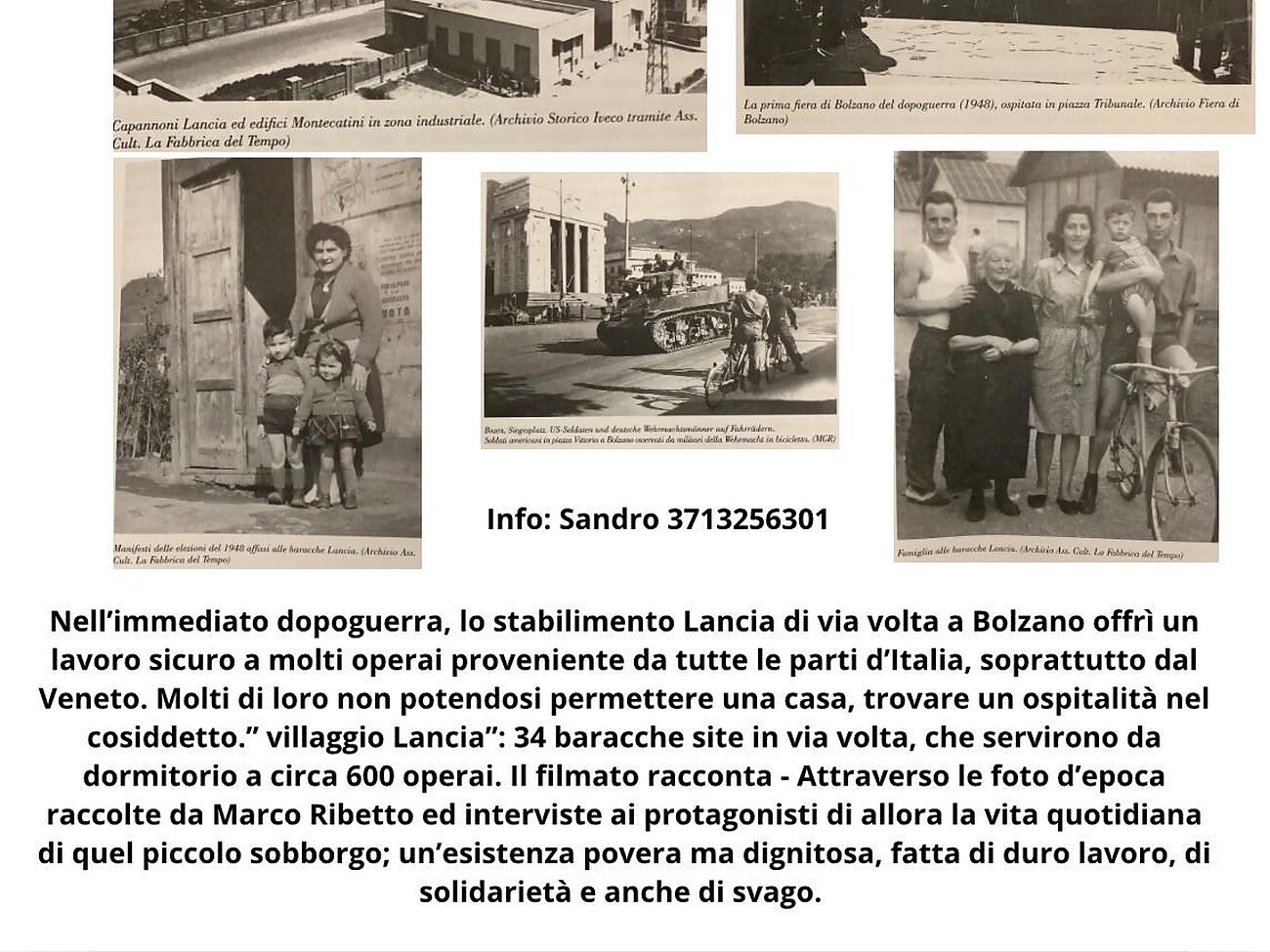 Unmittelbar nach dem Zweiten Weltkrieg bot das Lancia-Werk in der Via Volta in Bozen vielen Arbeitern aus ganz Italien, insbesondere aus Venetien, eine sichere Arbeitsstelle. Viele von ihnen, die sich keine eigene Wohnung leisten konnten, fanden Unterkunft im sogenannten „Lancia-Dorf“: 34 Baracken in der Via Volta, die etwa 600 Arbeitern als Schlafstätte dienten. Der Film erzählt – anhand von historischen Fotos, gesammelt von Marco Ribetto, und Interviews mit den damaligen Protagonisten – das Alltagsleben dieses kleinen Vororts; ein einfaches, aber würdevolles Leben, geprägt von harter Arbeit, Solidarität und auch Freizeit.