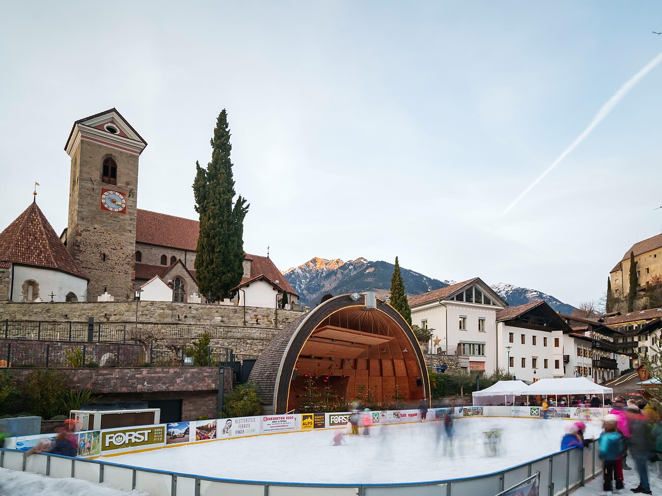 Der Eislaufplatz in Schenna ist vor der Show bis 16 Uhr geöffnet, sodass du selbst die Kufen schnüren und deine eigenen Runden drehen kannst.