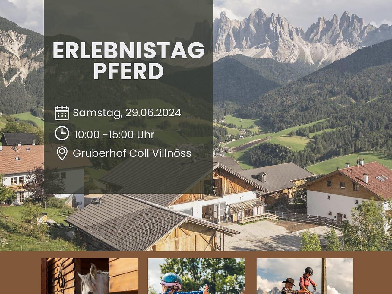 Beginnen wird der Erlebnistag um 10:00 Uhr mit einer Hofführung am Gruberhof, um Ihnen einen Einblick zu geben. Danach dürft ihr mit der Pferden spielen und sie verpflegen. Freut euch auf das Reiten und anschließend gibt es noch einen Ponyparcour. Dauer bis 15:00 Uhr.