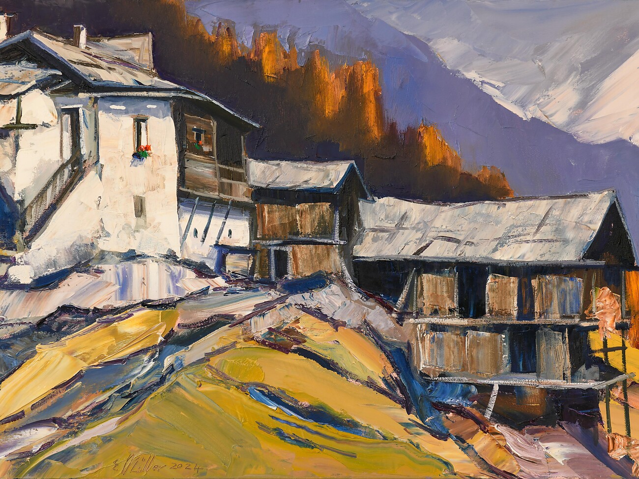 Beeinflusst von der genauen Beobachtung klassischer Vorbilder wie Albin Egger Lienz, Toulouse-Lautrec und Claude Monet, schuf Müller zunächst Szenen aus dem bäuerlichen Alltag, später vor allem urige Bauernhöfe und malerische Landschaften, die heute als sein Markenzeichen gelten. Die Sehnsucht und das Heimweh, die den Künstler seit seiner Kindheit begleiten, sind in seinen Ölbildern allgegenwärtig. Er fängt den Zauber der Südtiroler Bergwelt in leuchtenden Farben und pastosen Texturen ein, die Betrachtende in eine vergangene Welt entführen.