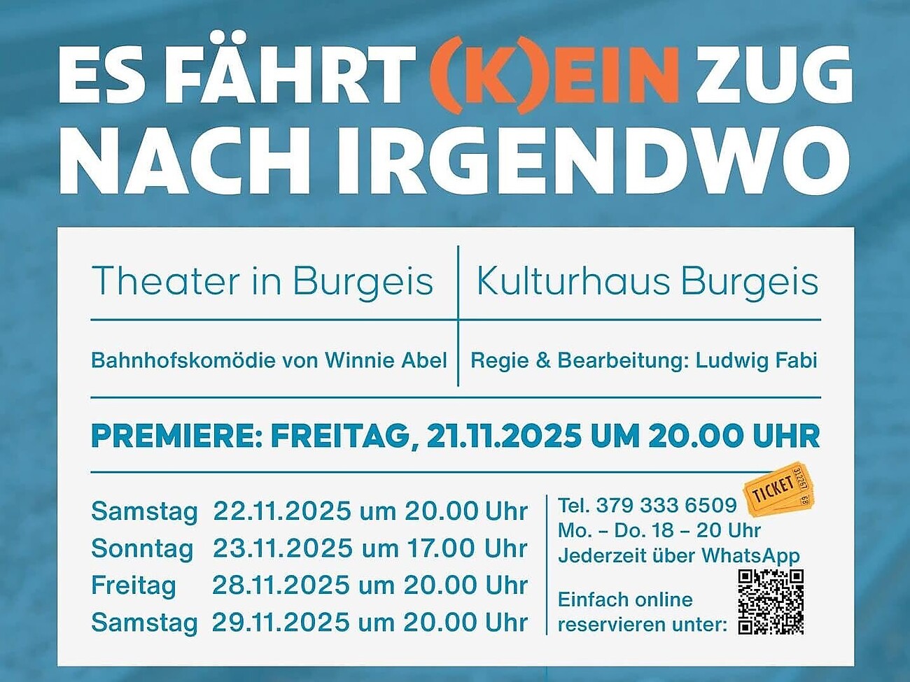 Zum Stück: Das Stück ist eine Bahnhofskomödie von Winnie Abel, in einer Bearbeitung von Ludwig FAbi. Die neue elektrische Vinschgerbahn hat Startschwierigkeiten und die illustren Fahrgäste bekommen das auf vielfache, nervige, aber auch witzige Weise zu spüren. Die Zuschauer werden zu Mitreisenden und immer wieder amüsant und unkomlizier ins Spielgeschehen eingebunden.