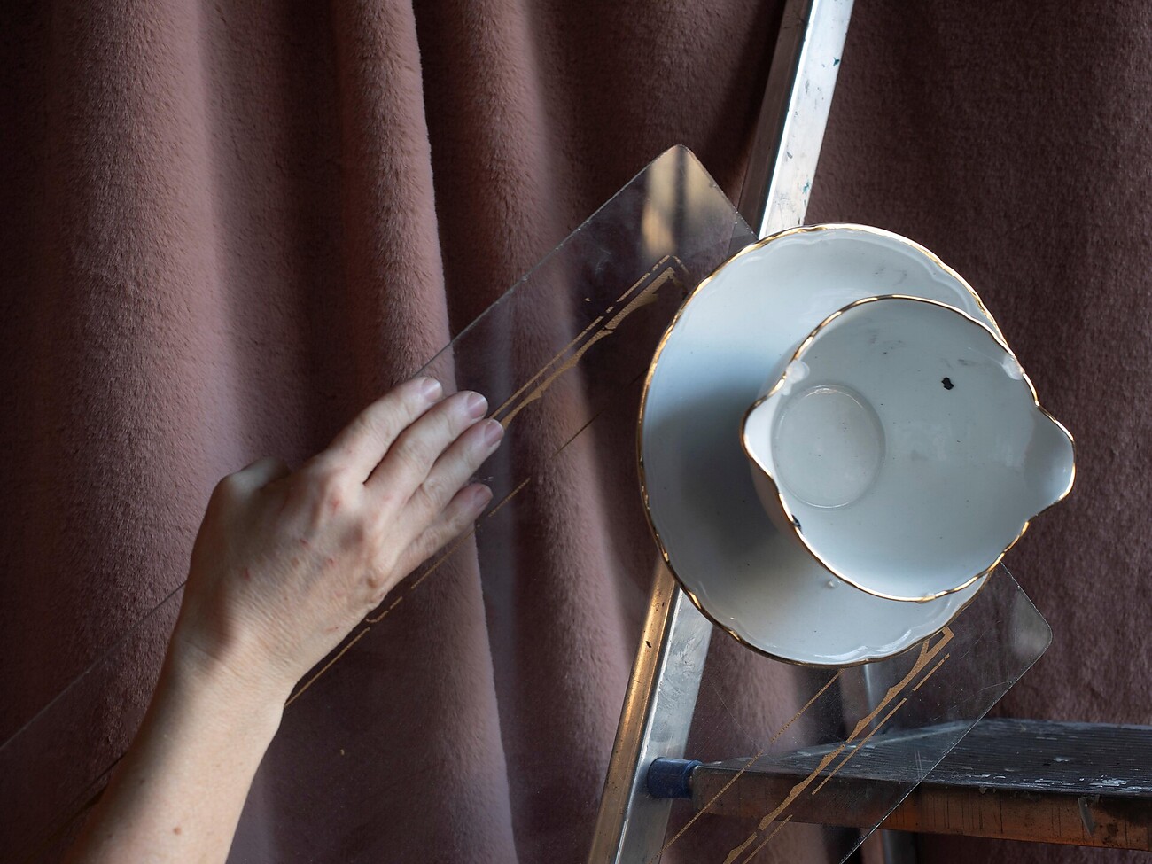 Retroscena vereint eine Serie jüngerer Fotografien, in denen das Element der Leiter – Sinnbild für den Aufbau der Szene – wiederkehrt, mit einer neuen Installation, die der Ausstellung ihren Titel gibt. Dieses site-specific-Werk wurde aus Backstage-Materialien aus dem Lager von Foto Forum geschaffen – Überreste früherer Ausstellungen. Die Installation verläuft längs durch den Raum, durchschneidet ihn mit einer architektonischen Fläche aus Öffnungen und Schichtungen, die zu materiellen Spuren einer sedimentierten Zeit werden. In diesem Kontext lädt die Künstlerin das Publikum ein, sich durch den Raum zu bewegen und Teil der Szene zu werden – Beobachter:innen und zugleich Akteur:innen in einer spiegelnden, doppelten Umgebung, in der Vorder- und Rückseite ineinander übergehen. In den Falten des Stoffes und den Fragmenten der Objekte taucht die Erinnerung als visuelles Archiv auf, offen für fortwährende Prozesse des Grabens und Neuformens.