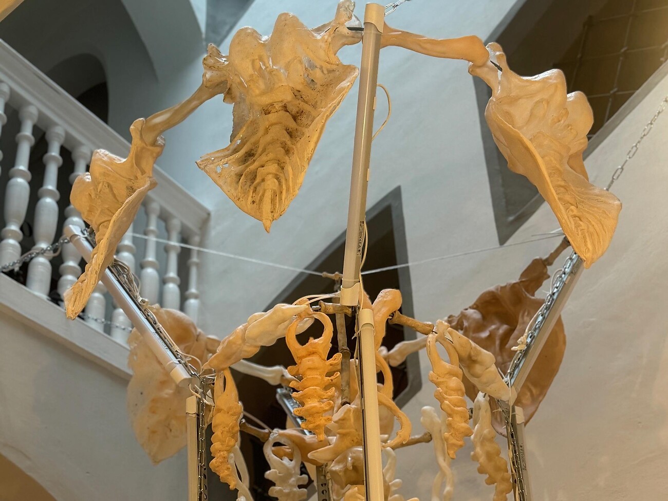 Die Gehänge selbst erinnern an Fossilien. Mehr oder weniger vollständige Überreste von Fantasiefischen, Schnecken und anderen unerklärlichen Meereswesen lassen die Betrachter*innen in unbekannte Sphären eintauchen. Das skulpturale Objekt Everything Loose zoomt direkt ans Zentrum eines bewohnbaren Ortes und die von ihm beherbergten Wesen zwischen Tier und Mensch heran.