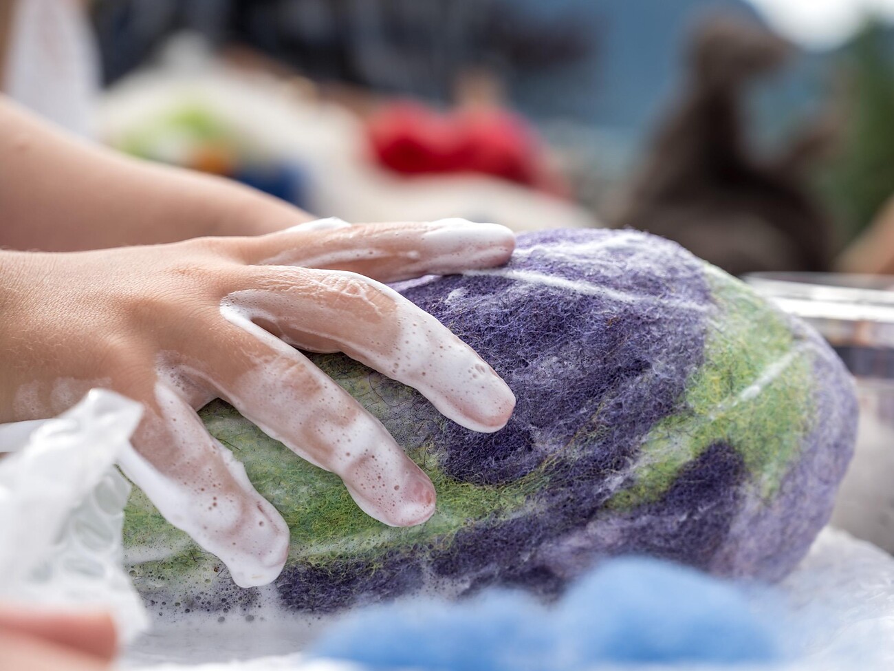 Filzen bietet Groß und Klein gestalterische und handwerkliche Entfaltungsmöglichkeiten und spricht alle Sinne an. Und weil besondere Schätze auch einen entsprechenden Beutel brauchen, erstellen wir mit Seifenschaum und verschiedenfarbigen Wollschichten unser eigenes Filzwerk das wir für den Zweck mit wunderschönen Farbverläufen, Mustern und Applikationen gebührend gestalten. Schnelle Erfolgserlebnisse sind garantiert.