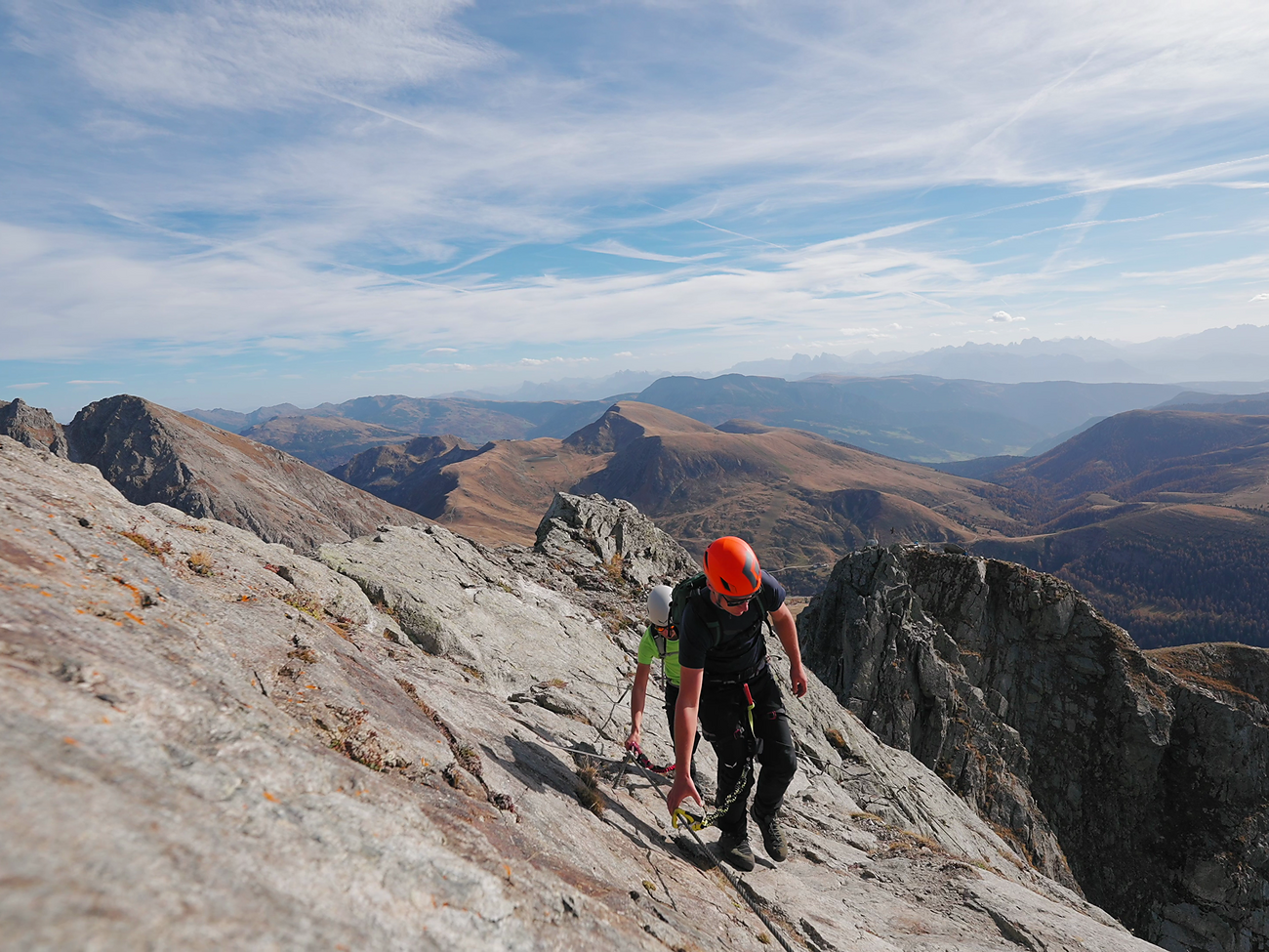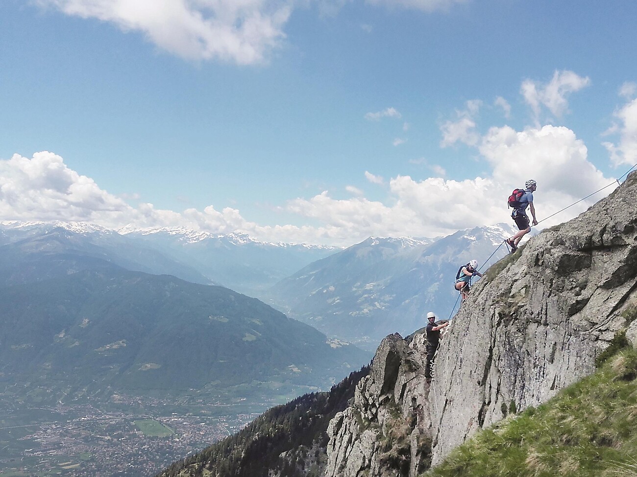 Eine der schönsten und aussichtsreichsten Aufstiegsrouten auf diesen spektakulären Aussichtsberg im Meraner Land führt über den Heini Holzer-Klettersteig. Der 550 Höhenmeter lange Aufstieg ist mit 1000 Metern Stahlseil perfekt gesichert und weist mittlere Schwierigkeitsgrade (A - B - B/C) auf. Unter der fachkundigen Anleitung eines staatlich geprüften Bergführers werden die eindrucksvollen Passagen über die schroffen Felskanten des Ifingers überwunden. Klettersteig-Neulinge und Familien mit geh- und kletterfreudigen Kindern ab 14 Jahren finden hier eine durchaus machbare sportliche Herausforderung und werden ein unvergessliches Erlebnis haben!