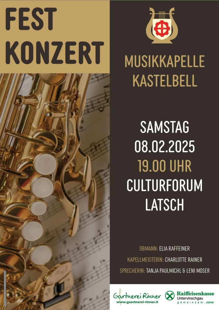 Veranstalter: Musikkapelle KastelbellDie Musikkapelle Kastelbell lädt Sie, ihre Freunde und Familie zum Festkonzert am Samstag, 08.02.2025, um 19:00 Uhr im Culturforum Latsch herzlich ein.