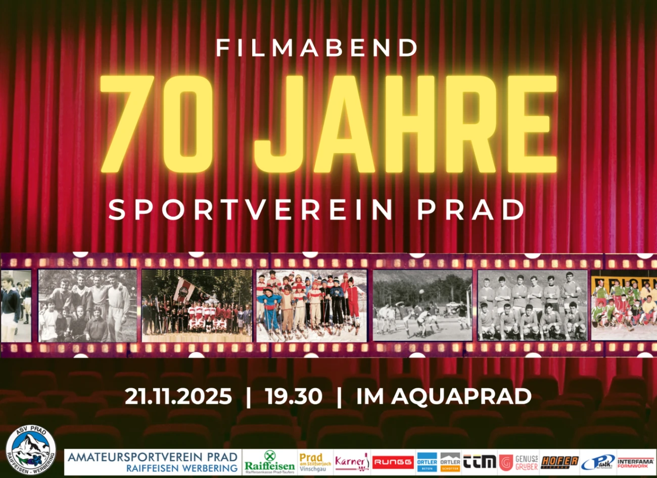 Der Sportverein Prad am Stilfserjoch feiert runden Geburtstag und wird stolze 70 Jahre alt! Zur Feier dieses Anlasses wird im Raiffeisensaal von aquaprad ein Jubiläumsfilm gezeigt, der die Geschichte des Vereins mit historischen Film- und Bildmaterial sowie interessanten Interviews erläutert. Alle sind herzlich willkommen!