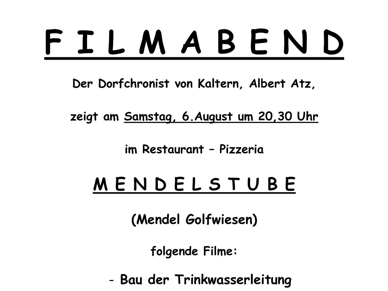 Der Dorfchronist von Kaltern, Albert Atz, zeigt am Samstag, 6. August 2022 um 20.30 Uhr im Restaurant Pizzeria Mendelstube folgende Filme aus seiner Chronistenarbeit: