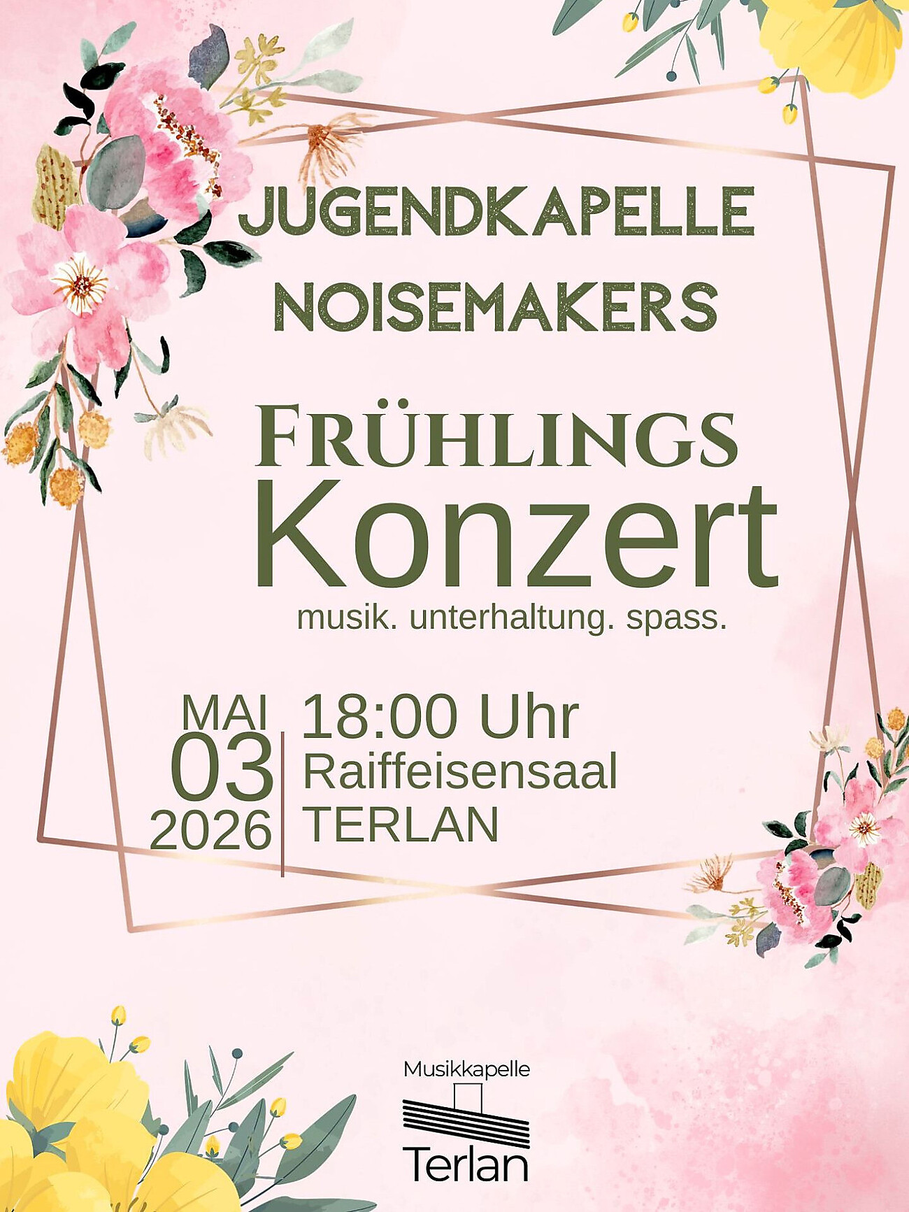 Die Jugendkapelle Noismakers der Musikkapelle Terlan veranstaltet ihr alljährliches Frühjahrskonzert. Präsentiert werden Hits quer durch die musikalische Frühlingsblumenwiese. Alle Interessierten und Musikliebhaber sind herzlich eingeladen.