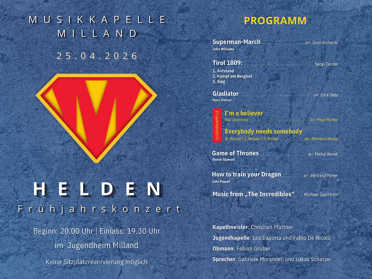 Die Musikkapelle Milland lädt herzlich zum jährlichen Frühjahrskonzert unter dem Titel „Helden“ ein. Erleben Sie am 25. April 2026 um 20:00 Uhr im Jugendheim Milland eine musikalische Reise durch die Welt der Helden.