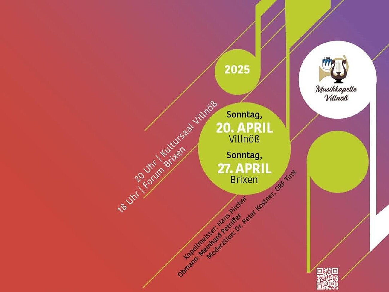 Das diesjährige Frühjahrskonzert der Musikkapelle Villnöss findet am Ostersonntag, 20. April um 20.00 Uhr im Kultursaal von St. Peter Villnöss statt.