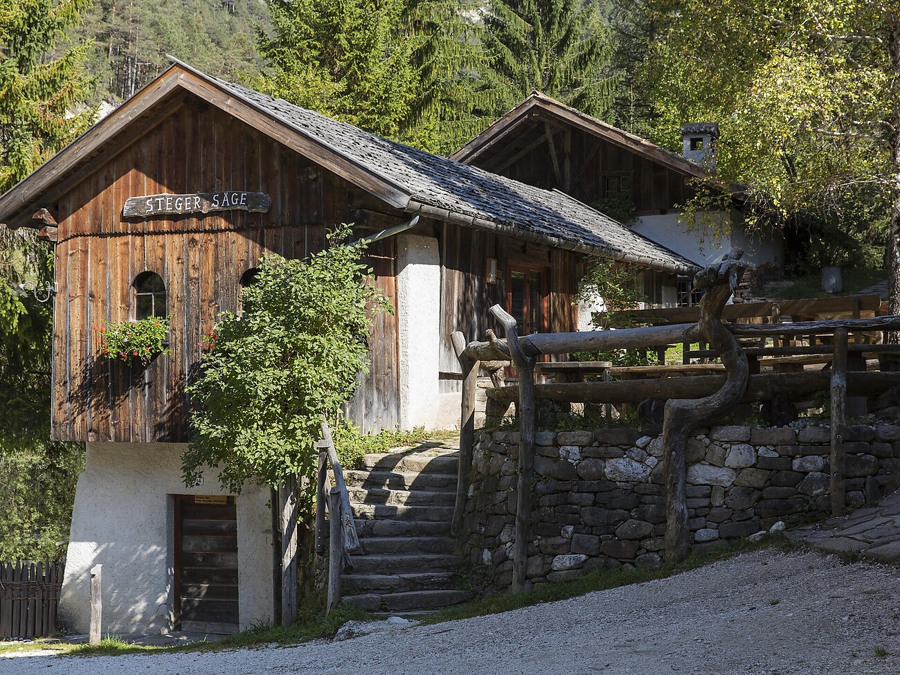 Am Eingang des Tierser Tschamintals, in der Fraktion Weißlahnbad, befindet sich die Infostelle Steger Säge.