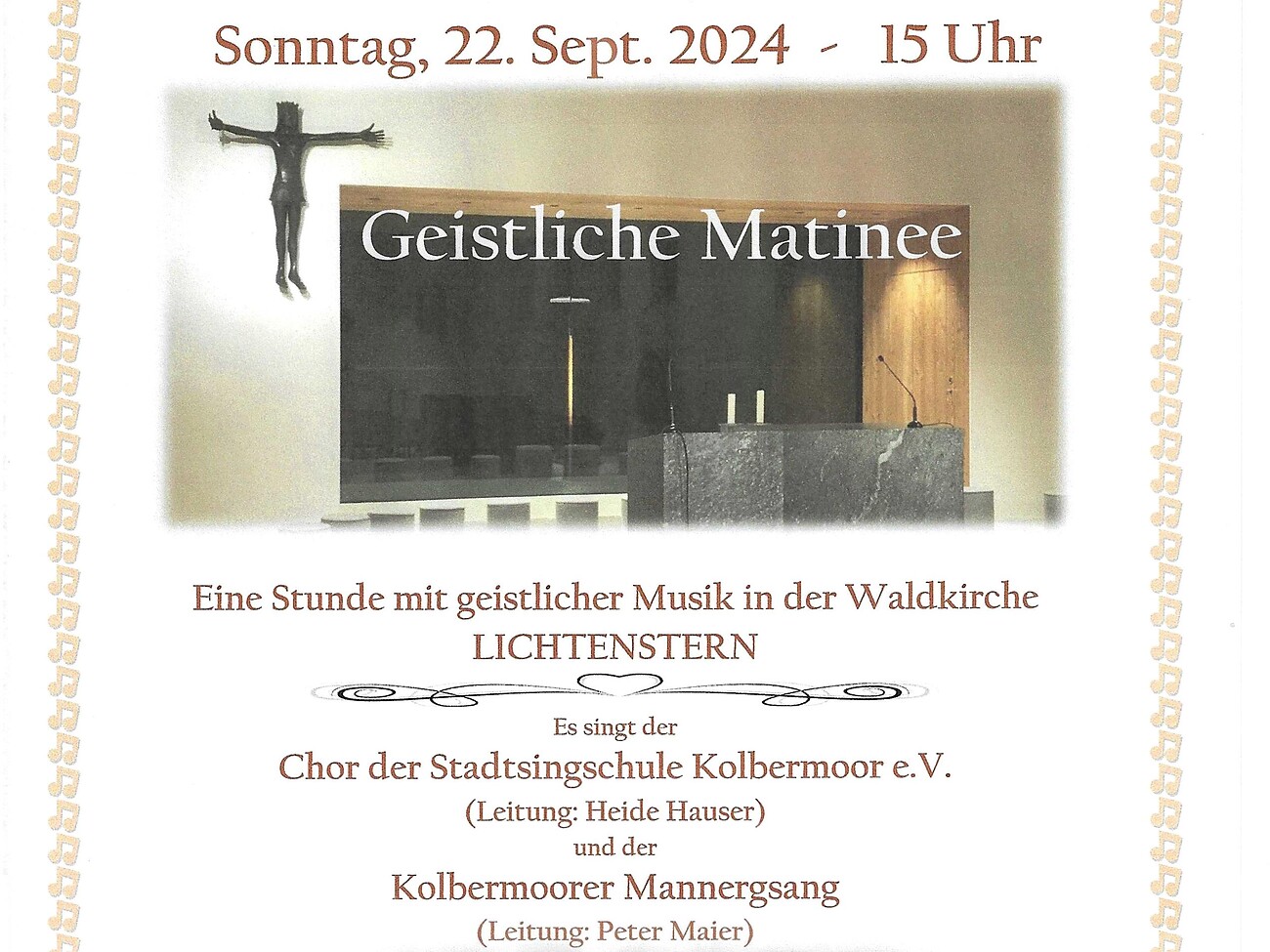 Eine Stunde mit geistlicher Musik mit dem Chor der Stadtsingschule Kolbermoor e.V. und dem Kolbermoorer Mannergesang aus Bayern in der Waldkirche Lichtenstern um 15 Uhr