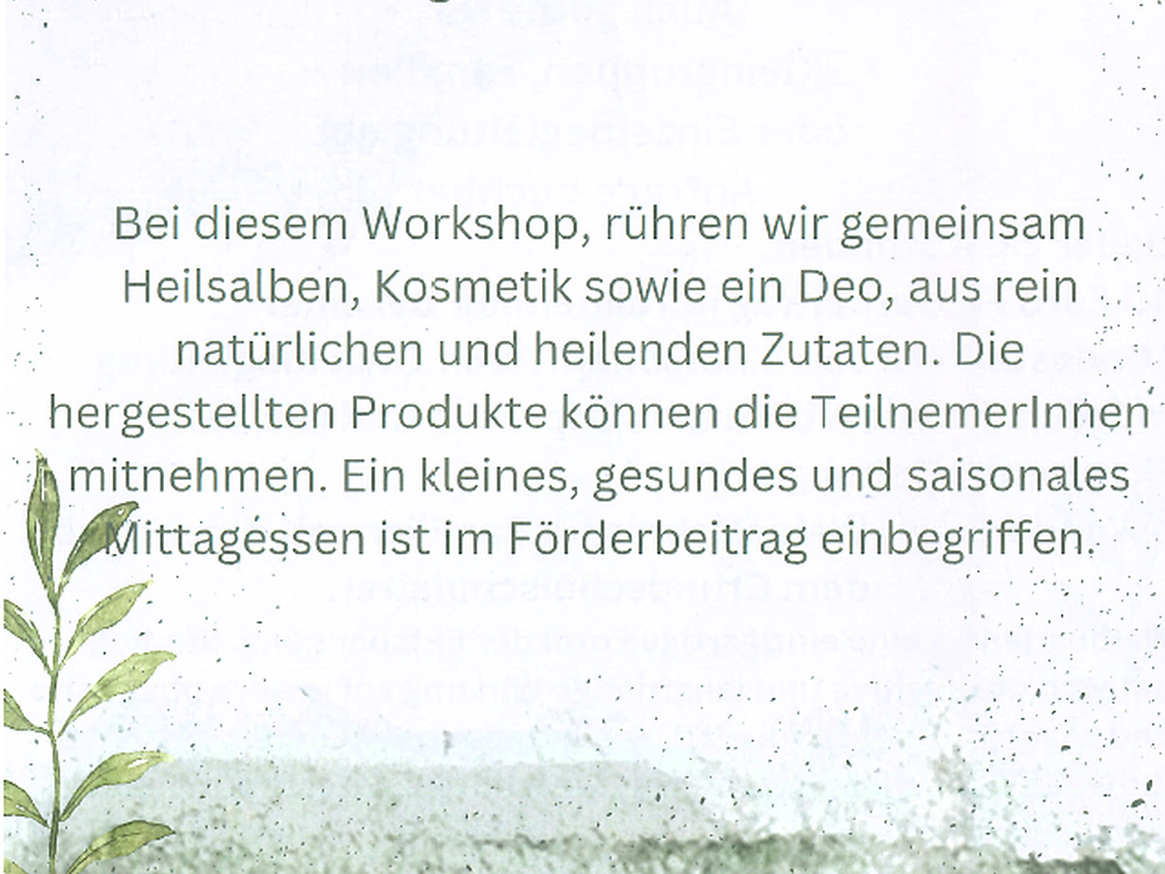 Bei diesem Workshop, rühren wir gemeinsam Heilsalben, Kosmetik sowie ein Deo, aus rein natürlichen und heilenden Zutaten. Die hergestellten Produkte können die TeilnehmerInnen mitnehmen. Ein kleines, gesundes und saisonales Mittagessen ist im Förderbeitrag einbegriffen.