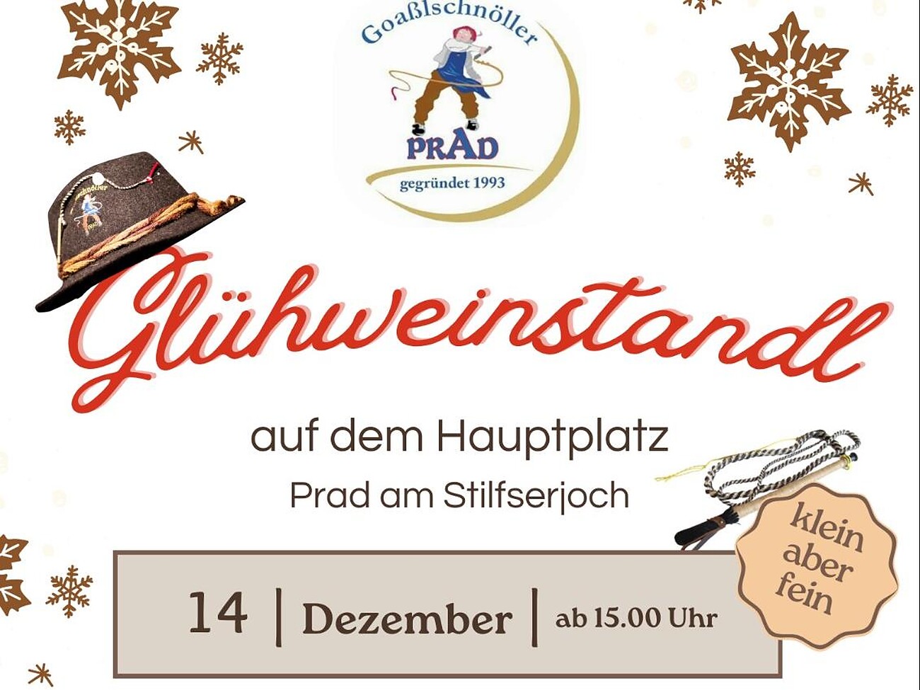 Kleines aber feines *Glühweinstandl* der Goaßlschnöller Prad am Samstag, den 14. Dezember auf dem Prader Dorfplatz ein.