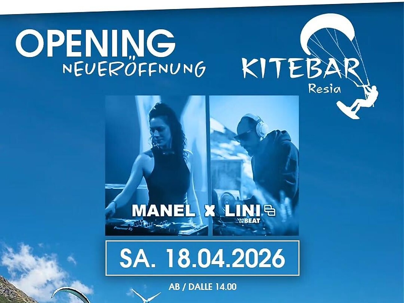 Feiere mit uns die große Neueröffnung der Kitebar am Reschensee! Ab 14:00 Uhr erwartet dich ein abwechslungsreiches Programm mit Bistro-Spezialitäten, kühlen Drinks und erstklassiger Musik. Für den richtigen Sound sorgen MANEL X LINI (Van de Beat). Genieße die einzigartige Atmosphäre direkt am Ufer mit Blick auf den See.