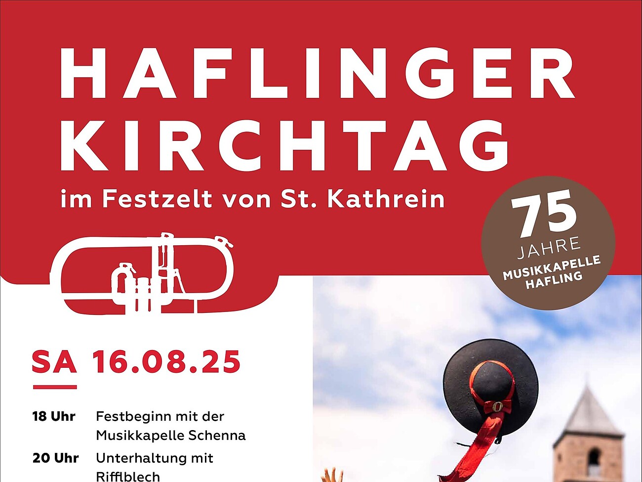 Die Musikkapelle von Hafling lädt anlässlich deren 75jährigen Jubiläums alle herzlich zum Haflinger Kirchtag im Festzelt bei St. Kathrein in Hafling ein.