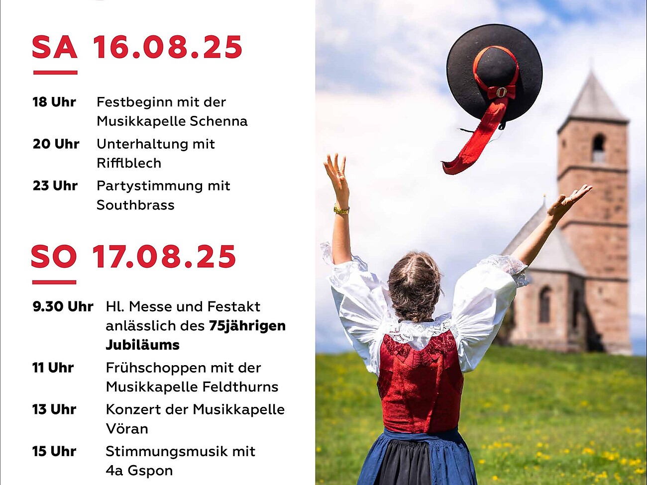 Sonntag: nach der Hl. Messe um 9.30 Uhr bei der St. Kathrein Kirche beginnt der Festakt des 75jährigen Jubiläums inklusive Strauben und Kinderschminken,