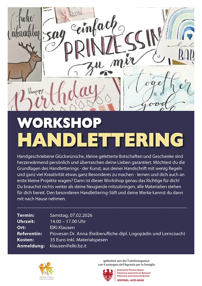 Veranstalter: Bildungsausschuss KlausenHandgeschriebene Glückwünsche, kleine geletterte Botschaften und Geschenke sind herzerwärmend persönlich und überraschen deine Lieben garantiert.