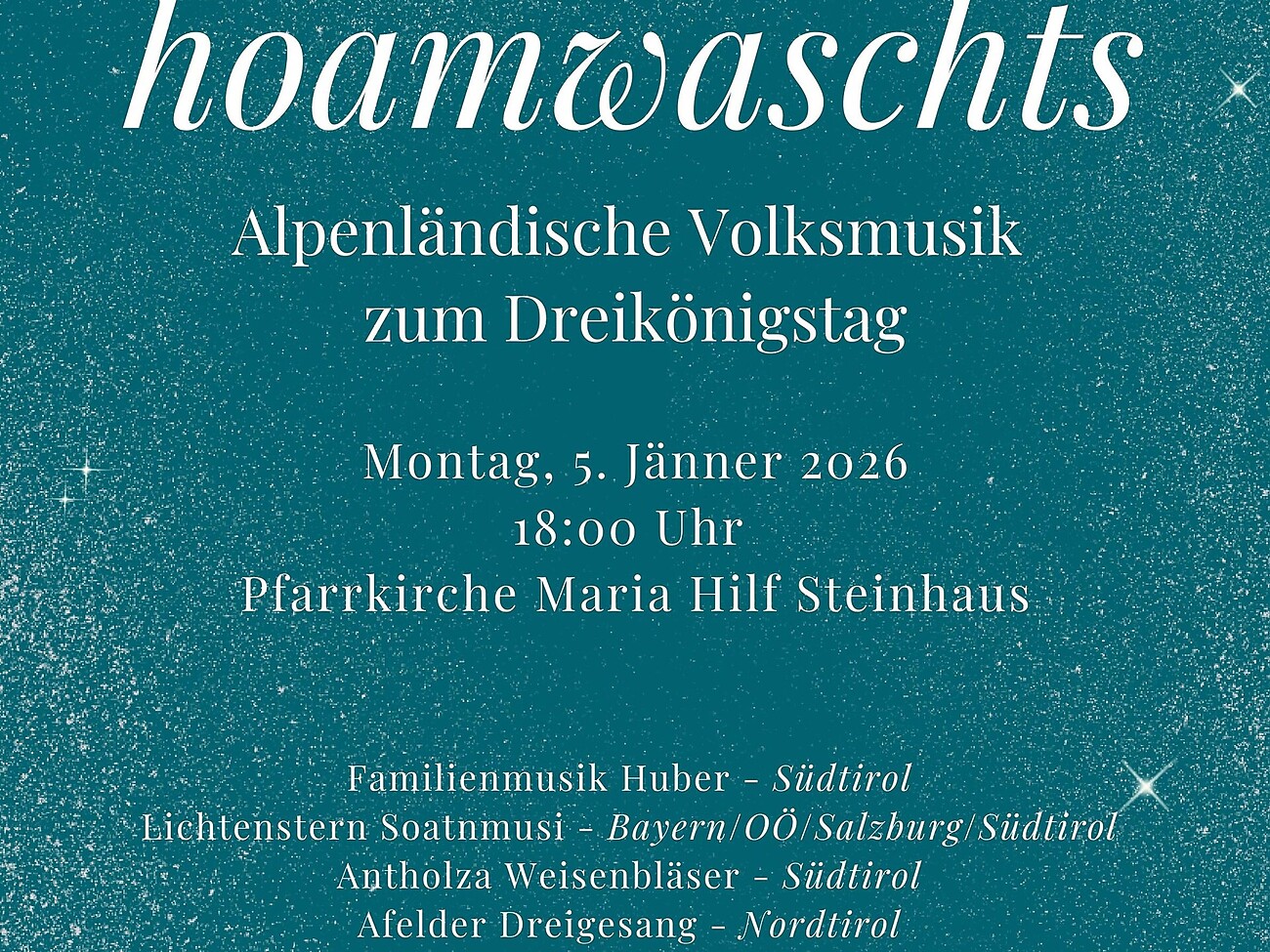 Alpenländische Volksmusik am Dreikönigstag mit der Familienmusik Huber, Lichtenstern Soatnmusi, Antholza Weisenbläser und dem Afelder Dreigesang. Eintritt frei