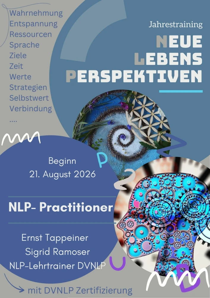 Veranstalter: Sigrid RamoserDer NLP Infonachmittag bietet Interessierten die Möglichkeit, sich umfassend über die Neurolinguistische Prozessarbeit zu informieren und erste praktische Übungen kennenzulernen.